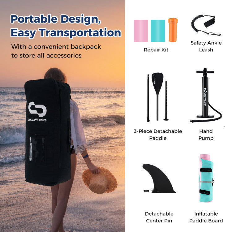 -Package Includes: 1 x Inflatable SUP, 1 x Adjustable Paddle, 1 x Center Fin, 1 x Safety Ankle Leash, 1 x Hand Pump, 1 x Backpack, 1 x Repair Kit, 1 x User's Manual