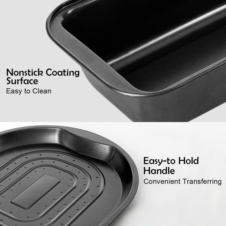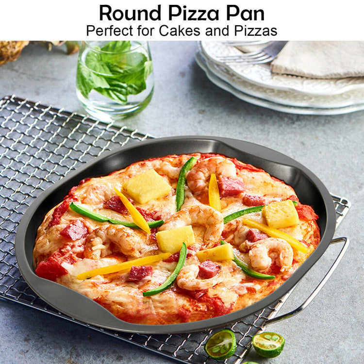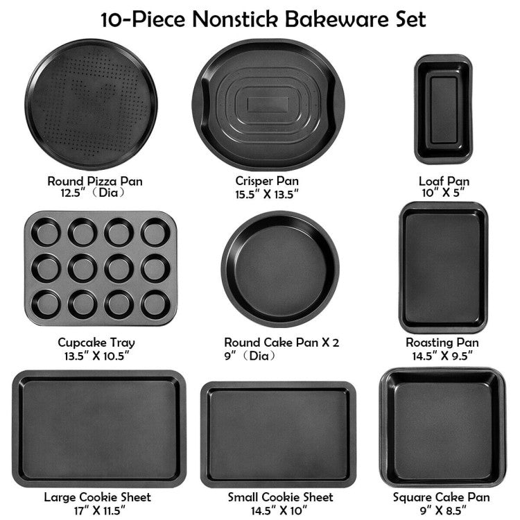 This set contains 1 crisper pan, 1 loaf pan, 1 round pizza pan, 1 cupcake tray, 1 small cookie sheet, 1 large cookie sheet, 1 roasting pan, 1 square cake pan, and 2 round cake pans, all of which are made of carbon steel with non-stick coating. Therefore, these pans not only have good rust resistance and thermal conductivity but also allow food to slide on and off smoothly. The dark black color also improves the quality and speed of the baking process. Besides, these pans are ideal for all kinds of cooking methods including cooking, baking, frying, roasting, steaming, poaching, stir-frying, etc. This professional-grade baking pans can withstand temperature from -40? to 446?. The humanized designs, like extra-wide edges, easy-to-hold handles, make the baking pans easy to use.