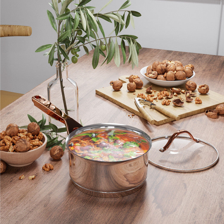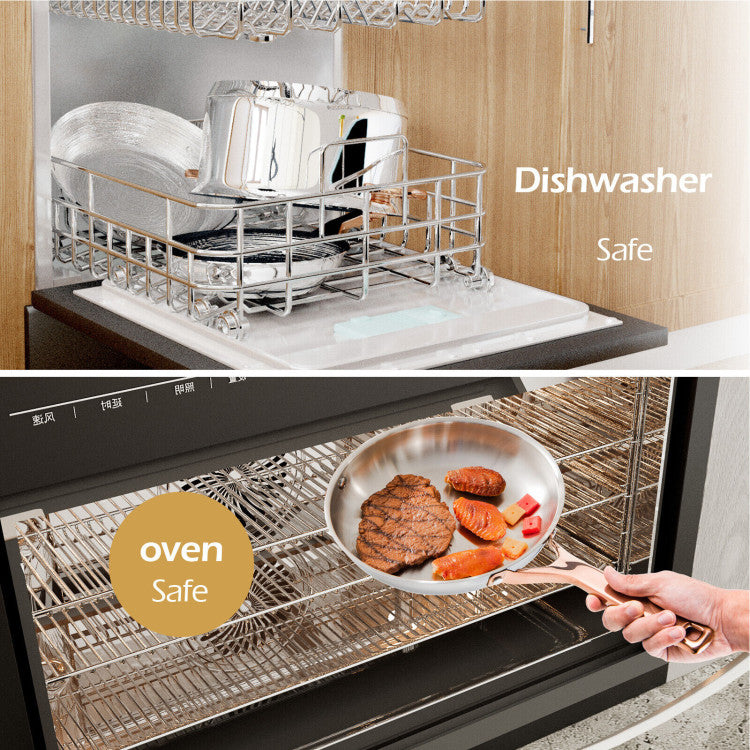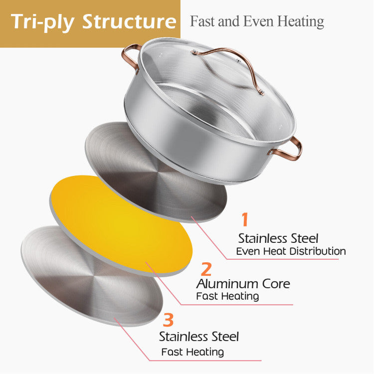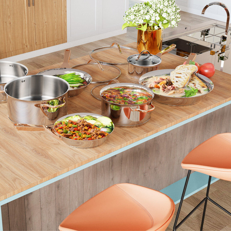 This set of cookware features a 3-ply base for fast and even heat induction and is adaptable to most of the cooking surface, gas, electric, induction or ceramic tops. It is oven safe up to 400°F and disinfection cabinet safe for easy sterilizing. Made of stainless steel with silver and rose golden finishes, this pots and pans set is of great quality with an elegant and stylish appearance. The long handle is firmly riveted to ensure a lifetime of perfect balance. The tempered glass lids with steam vents seal in flavor and enables you to monitor the food. This set of cookware is easy to hand-wash.