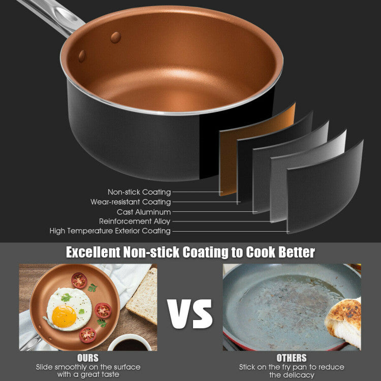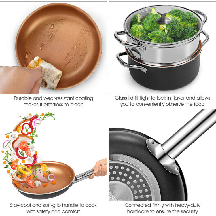 The cookware set consists of 12 pieces including 2 covered stock pots (1qt / 2qt), 2 casserole pots with lid (3qt / 5qt), 8" fry pan, 10" fry pan with a lid and a 9.5" steamer insert to provide multiply cooking methods.