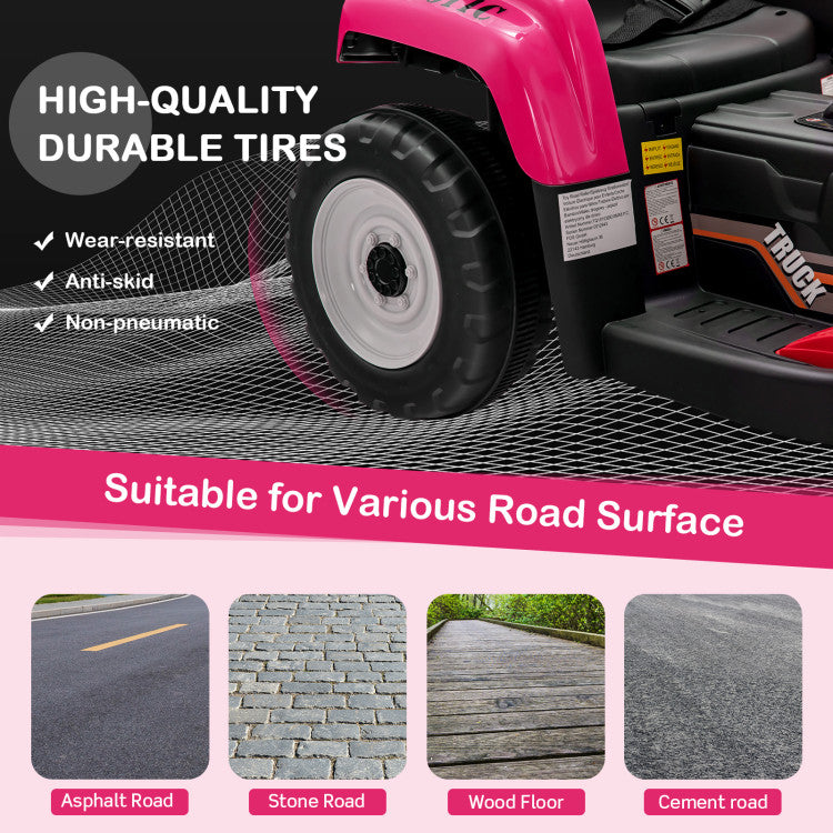 Forward/ backward lever, flexible steering wheel and the foot pedal ensure kids' easy operation. Kids can control the bucket handle to adjust height and angle of the bucket. It's also equipped with extra remote control for parents to control the car. Besides, it features headlight, horn, USB, and wireless connection for more joy. Anti-slip and wear-resistant wheels help kids to ride smoothly on brick roads, cement roads, wood floors, and asphalt roads. Its slow start function makes it even more safe to drive. What's more, it also possesses wide seat, safe backrest, and comfortable footrests. In addition, ASTM and CPSIA certifications make it safe for kids to use. Premium materials ensure long-lasting service life.