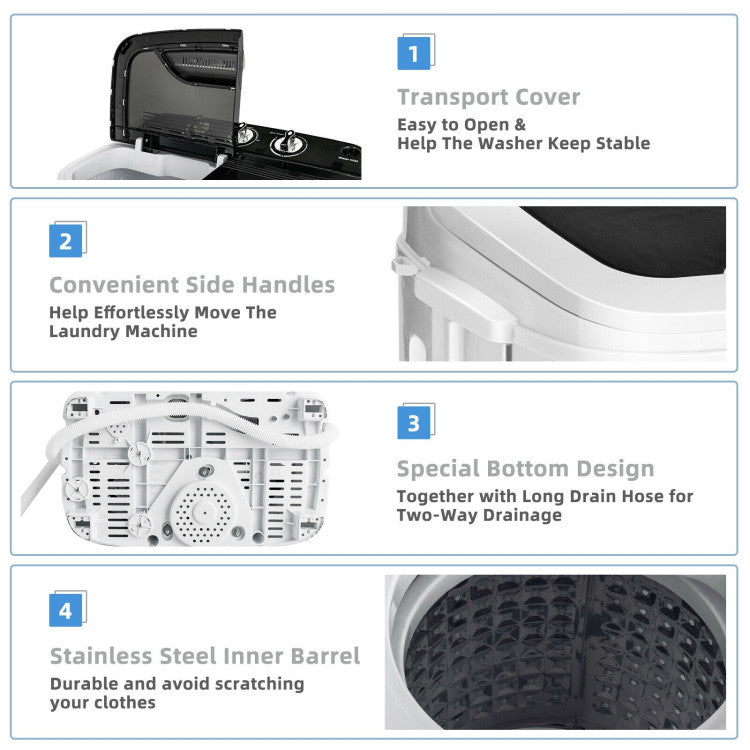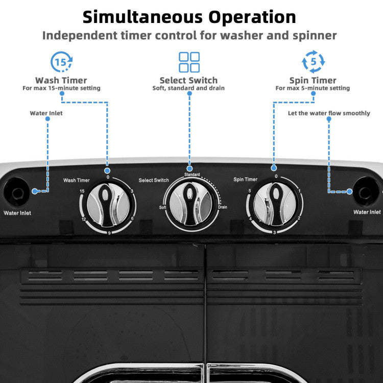 This washer is ideal for caravans, student flats and small accommodation where space is limited. The two tubs, one for washing and one for spinning which will be useful to you. The machine runs off 110 V power and will take up to 8 lbs capacity for washing and 5 lbs capacity for spinning. Not only is it environmentally friendly but it is energy saving. It has separate timer control settings for wash and spin operations. When you turn on the water you have to stay by the washer to watch it because it does not stop filling with water by itself.