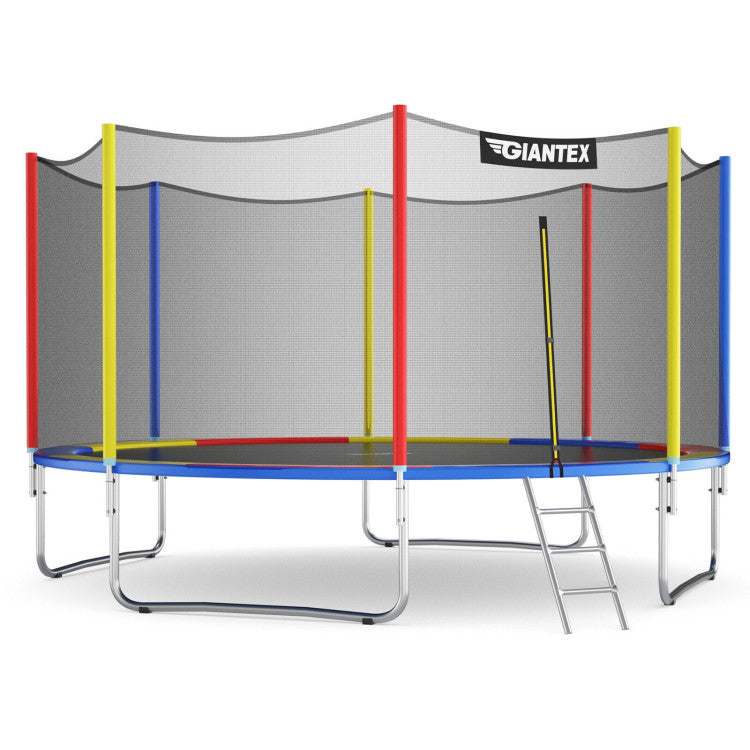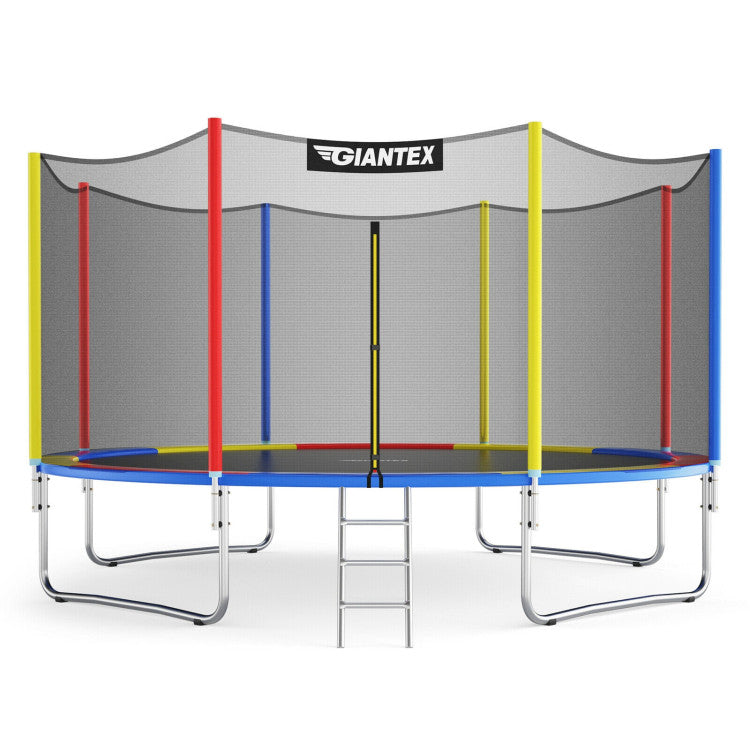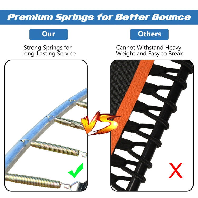 This colorful trampoline will make you fall in love with exercise! Jumping high and falling deep, you can have an exciting jumping experience, while at the same time exercise bones and muscles. The enclosure net with safety buckle, standing poles with EPE foam sleeves, and spring pads around the edge will guarantee the 100% safety for both adults and kids to use. What's more, the premium jumping mat and springs contribute to long-time service and better bounce.