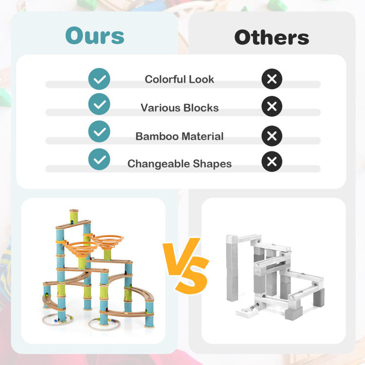 Kids can use different accessories to create different shapes with their imagination. Besides, premium bamboo material is odorless, BPA-free and safe to use. With our marble run set, kids can put down phones and start to enjoy the hand-on fun with their friend. And they can play it in kid's room, kindergarten, play room and more. Additionally, clear user manual and their corresponding shapes help kids to easily set it up. Light weight and carrying bag ensure easy carrying and storage.