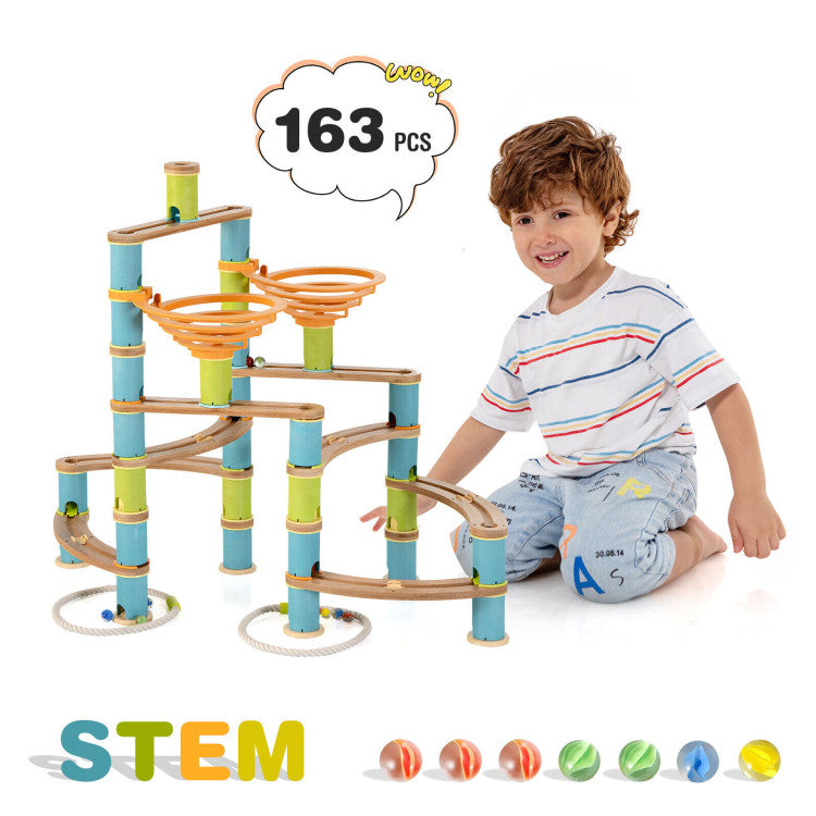 This marble run set consists of 163 pieces, including 3 straights, 6 curved rails, plenty of cylinders or bases, 2 funnels, 4 rings and 24 marbles.