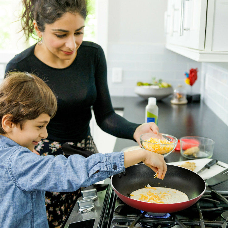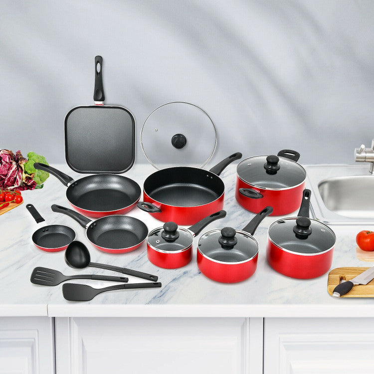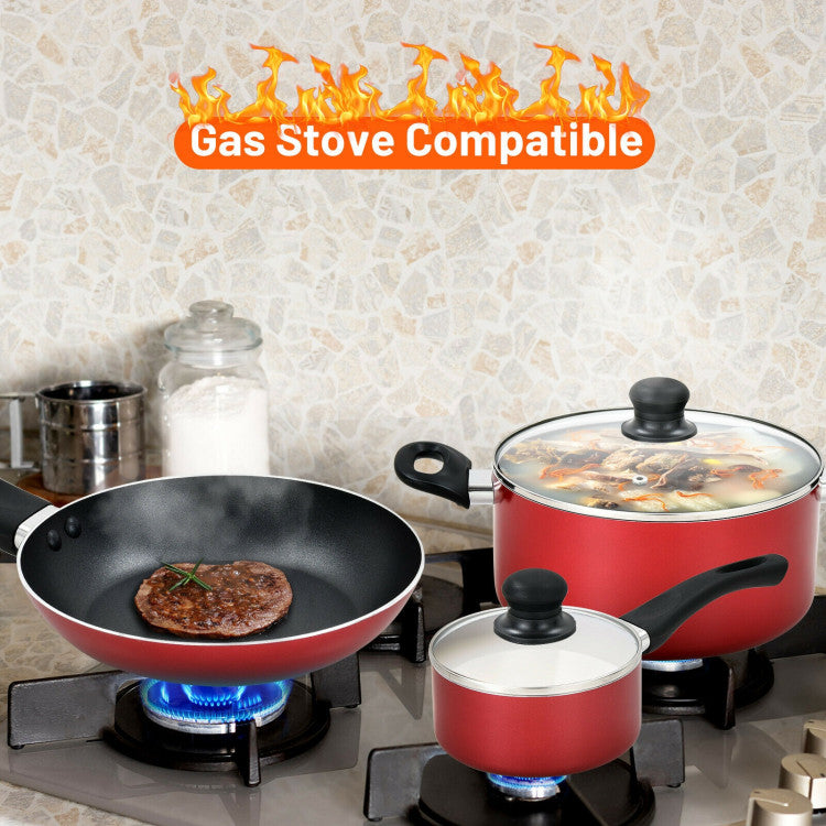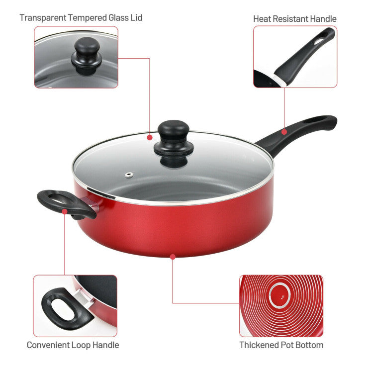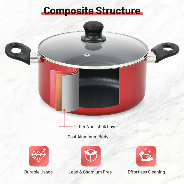 The cookware set is made of hard anodized aluminum to conduct heat evenly and ensures long service life. The combination of various pans, pots and kitchen utensils allows you to have more options for cooking, such as chicken, porridge, fish and so on. Plus, it comes with nonstick coating to keep food sliding smoothly along the surface and makes for easy cleaning. In addition to oven and dishware safe, the kitchenware is suitable for gas stove. Side handles prevent your hand from burnt and bring much convenience to lift up and down. The tempered glass lid is easy to observe the food during cooking.
