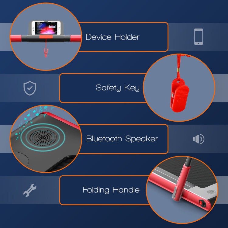 -Including 1 Folding Treadmill, 1 Remote Control(Need 1xCR2032 button battery, not included), 1 Phone Holder, 1 Safety Key, 1 Power Cord, 1 Instruction