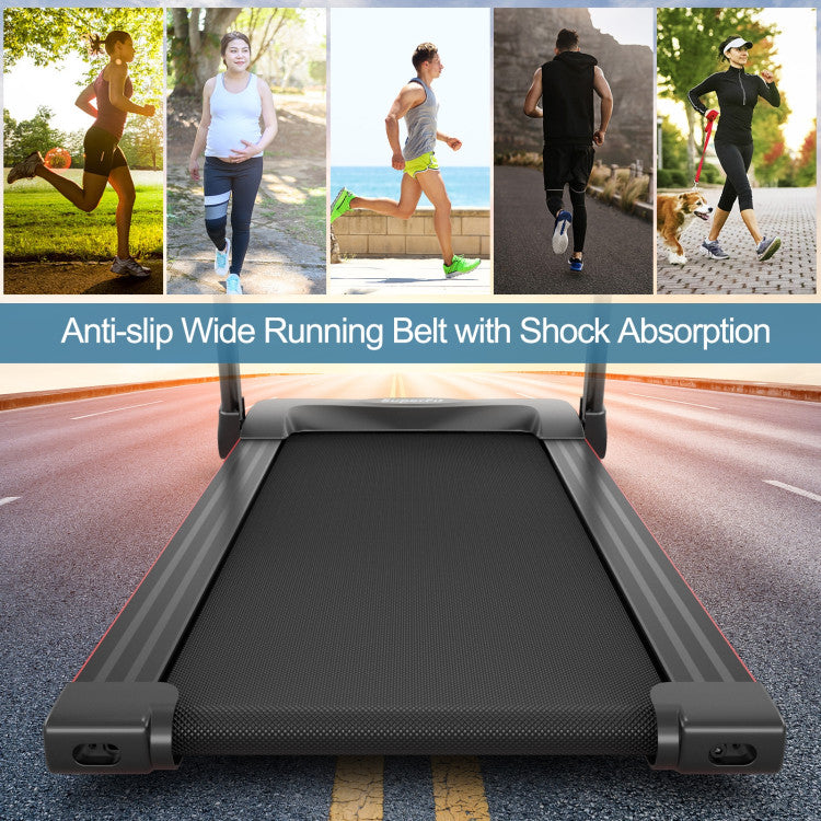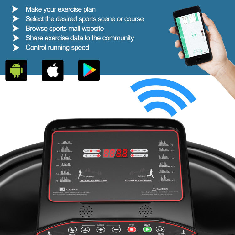 The HD LED control panel brings a lot of convenience in observing time, speed, calories, distance and heart rate. With 12 preset programs, auto /manual mode and 0.6-7.5 mph variable speed, the treadmill allows you to walk, jog and run. Thanks to the high-performance 2.25HP motor, you can enjoy the fun of indoor exercise in a quiet environment without disturbing others. And the widen 5-layer running belt gives you the flexibility to work out while protecting your knees and muscles. Heavy duty steel frame guarantees super stability for long-lasting service time. Stay healthy with this multifunctional treadmill!