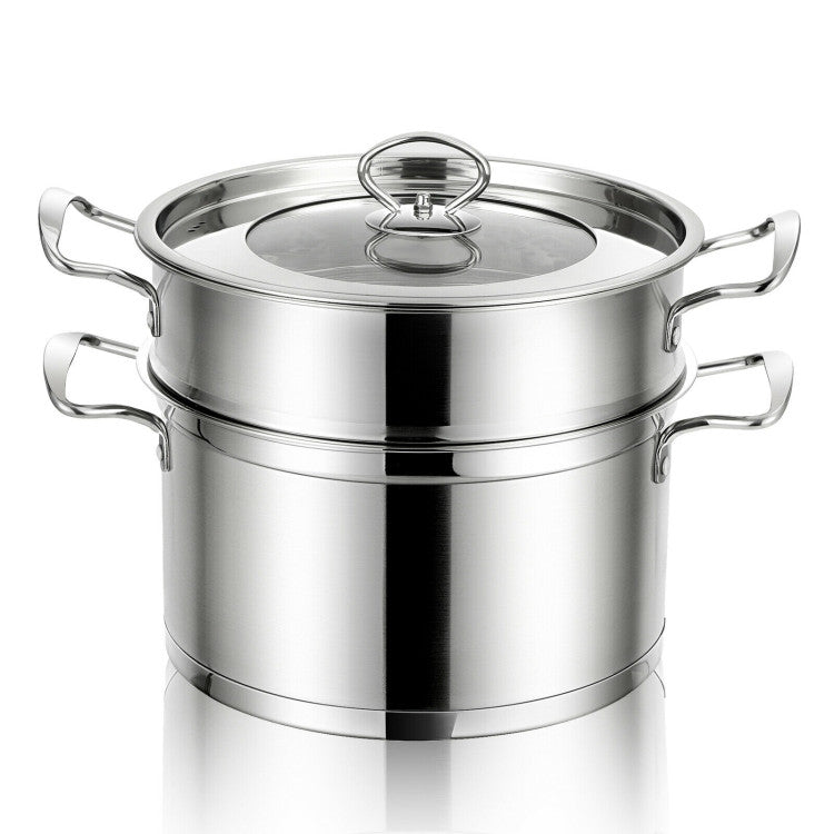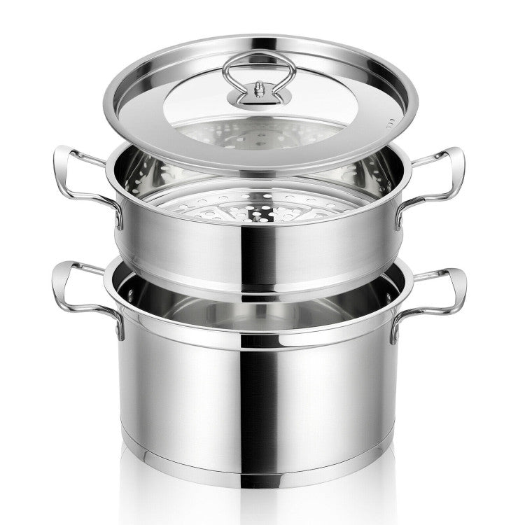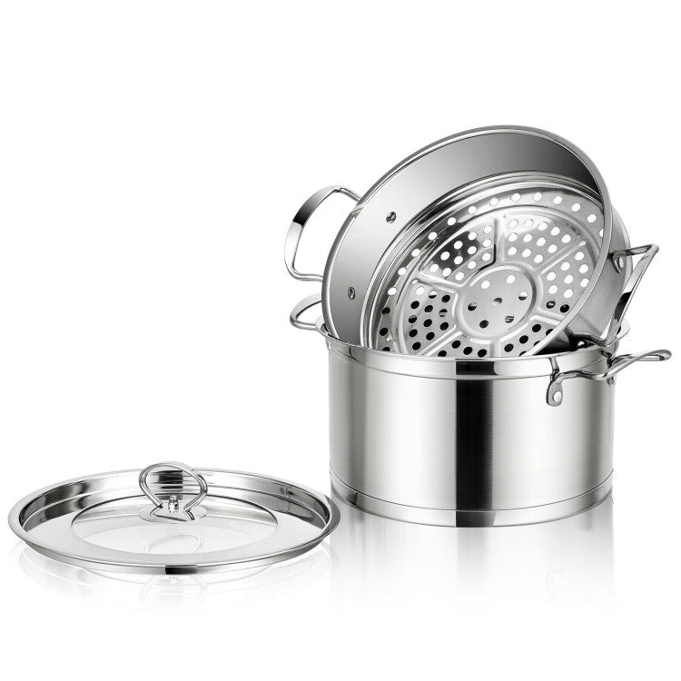 Designed with a 5.2 QT stock pot and a 2.3 QT steamer, this 2/3-tier steamer achieves multiple functions of steaming and boiling, which makes it possible for you to cook several kinds of food simultaneously. Made of food-grade stainless steel, it will not react with food when heated, providing you with a healthier diet.The steamer is also equipped with a glass lid, allowing you to better observe and have better control of the food. This steamer pot set must make the cooking more enjoyable.