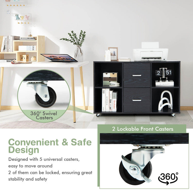 This wood file cabinet is a perfect helper for office and home organizations. And the wood-style finish can easily match other wooden furniture in your working or studying space. Besides, it includes 2 large drawers to store items away from dust, 4 open compartments to classify documents and files, and a spacious tabletop to hold large office machines such as printers, scanners, etc. More than that, the rolling file cabinet is equipped with five 360°-swivel universal casters and 2 of them have brake functions, so you move it easily and keep it in position safely. And the veneered surface is smooth and waterproof for easy cleaning. You can place the cabinet beside or under the desk, bringing convenience for your daily work or study!