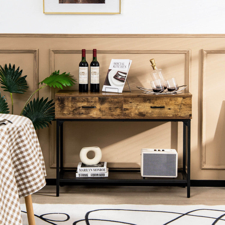 -Storage offered by a wide tabletop, 2 large drawers and a spacious wire shelf