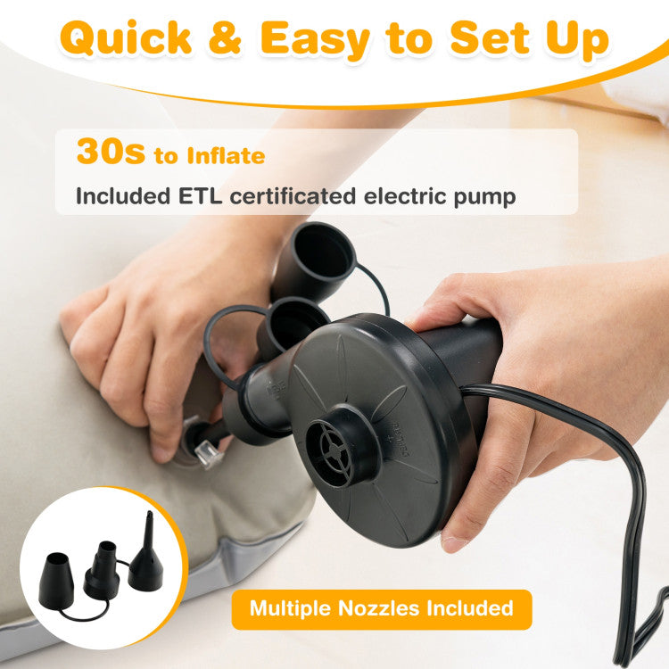 Made of high-grade PVC and flocking surface, the travel bed perfectly combines high durability and softness together, allowing children to sleep safely and comfortably. This multifunctional inflatable bed can also become a toy pool for children once you remove the mattress inside. Moreover, a functional electric pump is included in the package for you to quickly inflate the bed and mattress. Whether you're taking your child camping or to Grandma's house for a sleepover, this portable toddler travel bed will always be a fabulous choice.