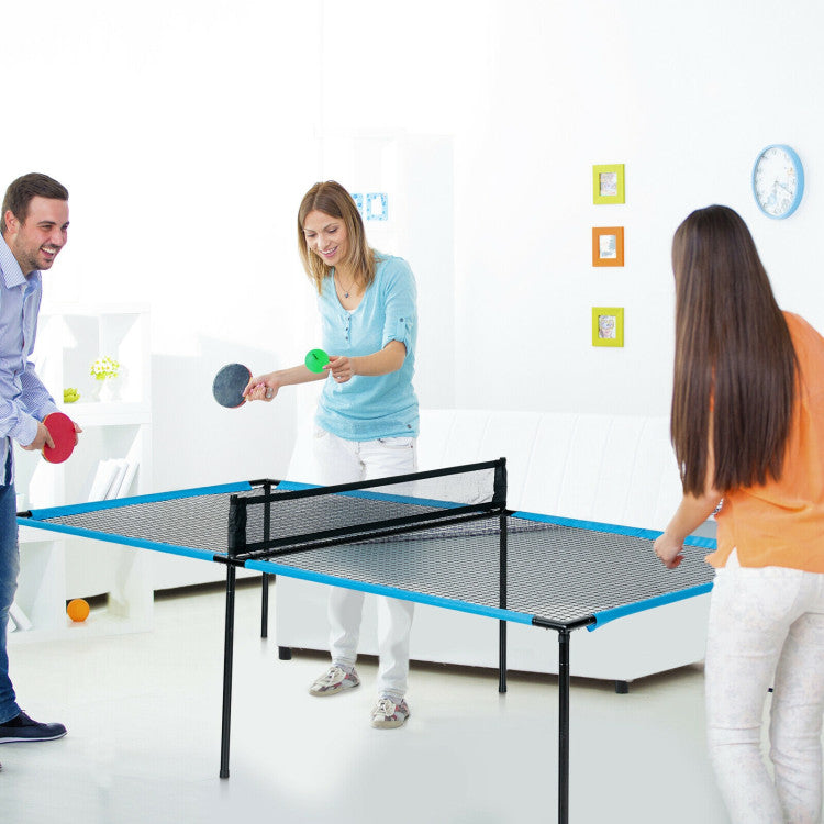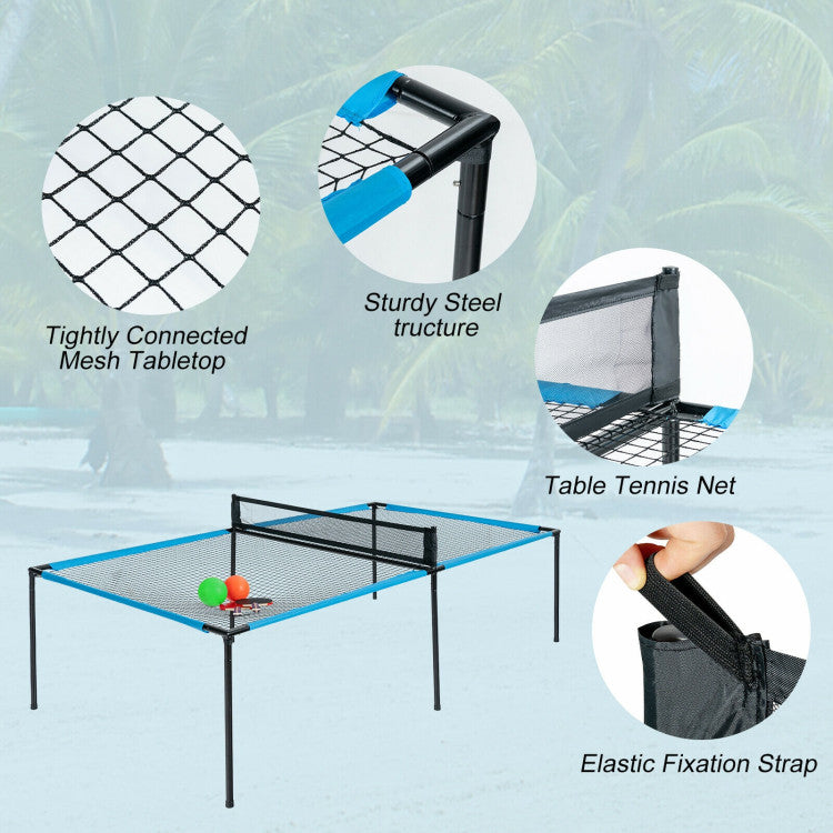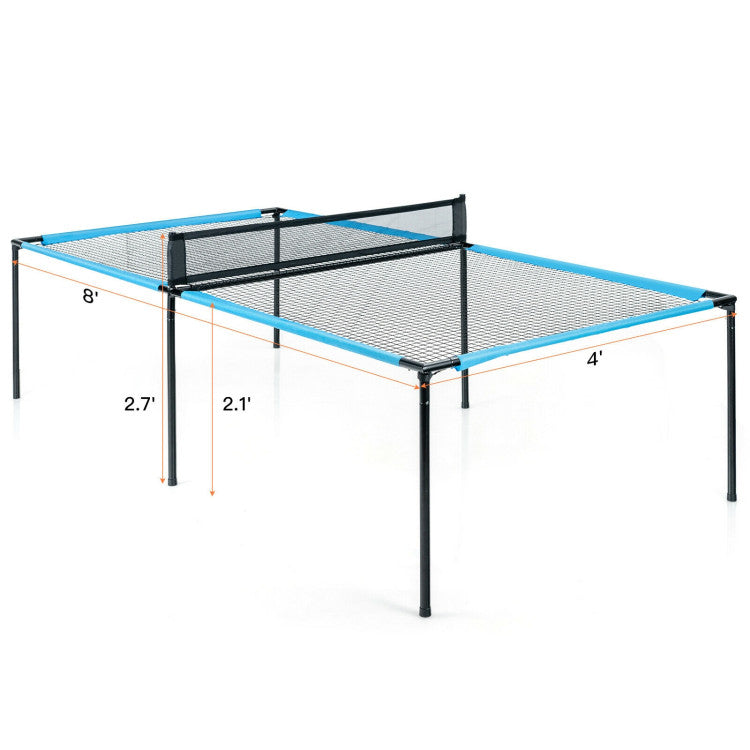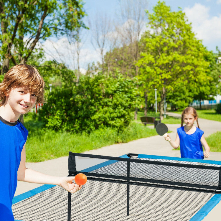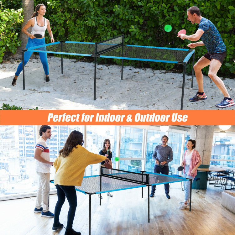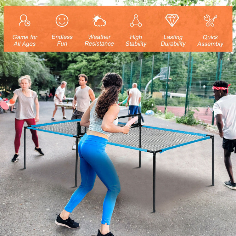 Simple gameplay and lucid rules are suitable for all ages to play together. There are 2 entertaining ways, volleyball game and table tennis game, for you to choose depending on the different player numbers. Comes with two paddles, two PVC balls of different sizes and one inflation pomp, this action-play game needs no extra accessories to play. Since heavy-duty steel material, the sturdy metal frame showcases excellent sturdiness. What's more, the tightly connected mesh table ensures consistent and reliable bounces. In addition, easy assembly needs less time and effort, so you don't need to worry about the table installation. This game set can be used indoors and outdoors, offering endless fun for your family.