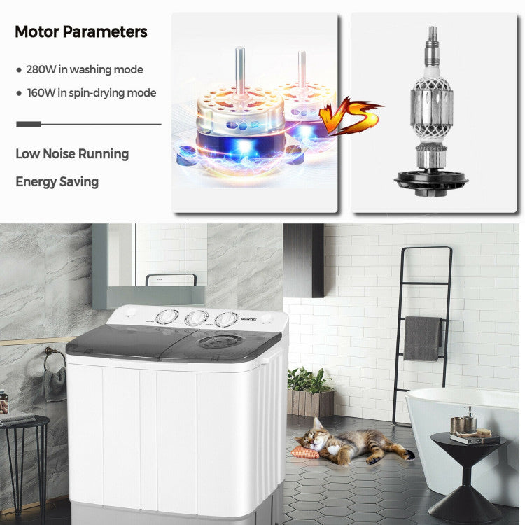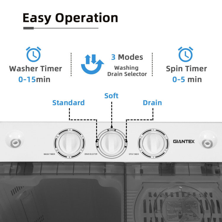 Small body but surprisingly large capacity makes this washing machine fit snugly into small space or corner in apartments, dormitories and bathroom. 2 large separate tubs(13.2lbs washing/8.8lbs spinning tub ) allow you to wash and spin dry a lot of clothes at the same time. The mashing machine has a easy-to-operate control panel facilitates you to set the desired time and mode (soft/standard/drain). With a high-class and low noise motor, it can help you save energy and ensure efficient laundry. What’s more, the built-in pump and drain tube let you drain out dirty water directly and avoid excessive water on the floor. Just drop clothes in, fill with water, add soap, and you can say goodbye to piles of dirty clothing!