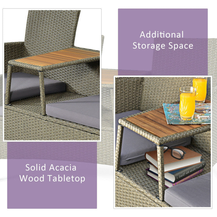 Made of high quality steel and rattan materials, this loveseat has a solid frame and can accommodate 2 adults easily. Thickened soft cushions can provide you with comfortable seating experience. The cushions are covered with zippered non-woven fabric which is durable and easy to clean. A wood coffee table between the 2 seats is convenient for you to place some cups, snacks and so on. The space under the tabletop ensures you to store some books. With this appropriate size, this loveseat is suitable for outdoor living space, such as patio, garden, backyard and lawn.