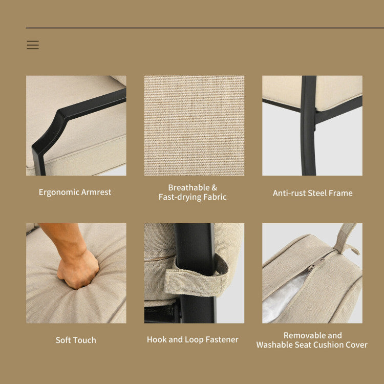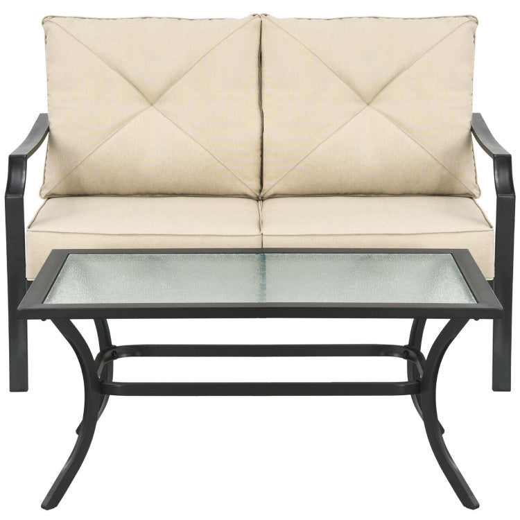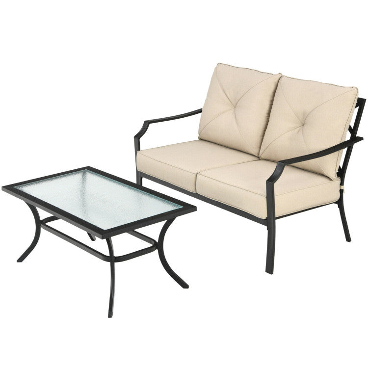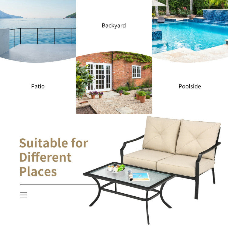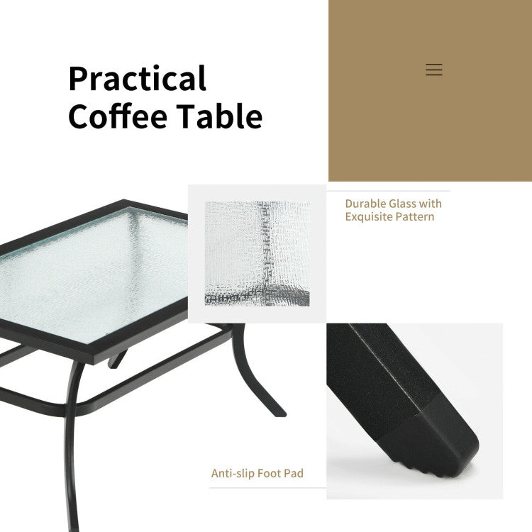 Including loveseat and coffee table, this outdoor patio furniture will be the perfect place to enjoy your leisure time. The thick and soft cushions are comfortable for sitting. Meanwhile, the ergonomic backrest and armrest can support your body cozily. And you can put your items on this large coffee table. What's more, the rustproof steel frame, breathable olefin fabric, quick-drying fabric and high quality glass make our outdoor sofa bench and coffee table durable and stable.