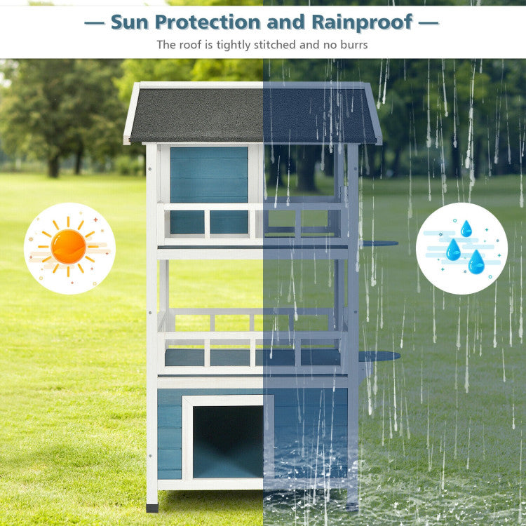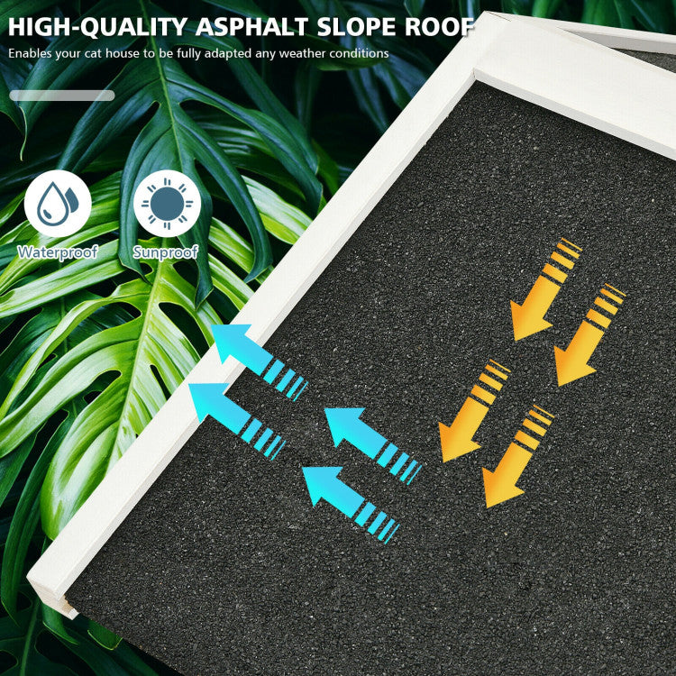 This wooden cat house features 3-tier activity place which allows your kittens to take a nap, enjoy sunbathing, jump up and down, fully meeting their instincts of high independence and territoriality. Equipped with sloping asphalt roofs and waterproof painting, the cat house will keep dry and warm on rainy or snowy days. Plus, the elevated bottom floor with plastic feet protects against decay. Crafted with fir wood and engineering wood, each part is stamped separately and easy to assemble with pre-drilled holes, ensuring stability and durability. And there are 2 escape doors and 2 jumping platforms which not only provide fun entrances for your lovely kittens but also allow you to observe inner conditions. This multi-layer cat castle will be an eye-catching addition to your backyard, porch, indoors, and so on.