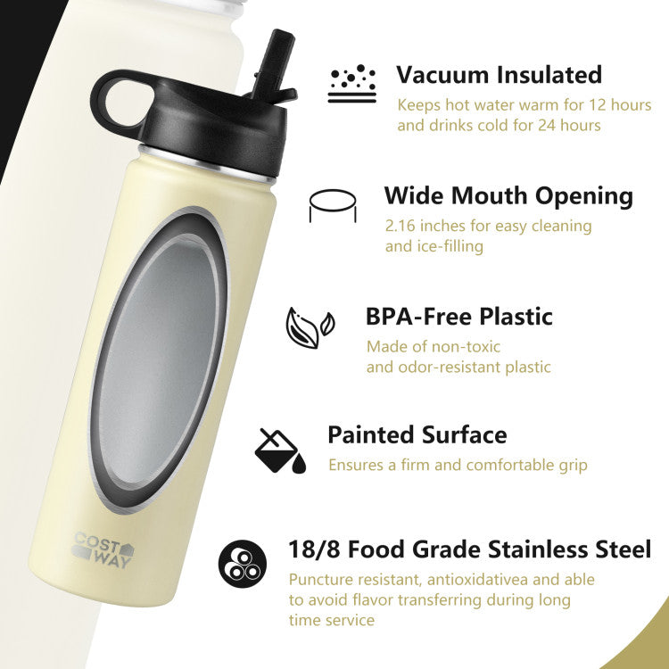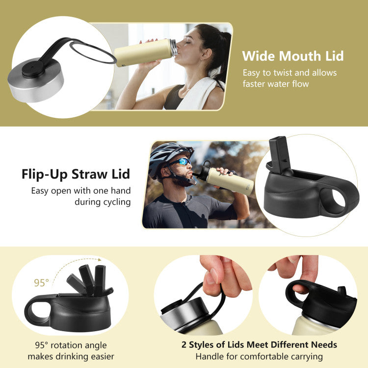 Double-walled insulation technology can keep beverages hot for up to 12 hours and cold for 24 hours. Besides, made of food-grade and BPA-free materials, this bottle does no harm to your health when you drink. It has a 360-degree sealing ring to prevent leaking and a side handle for easy holding, offering you much convenience. Moreover, we also design it with 1 wide mouth lid, 1 flip-up straw lid, and 1 straw to meet your different needs.
