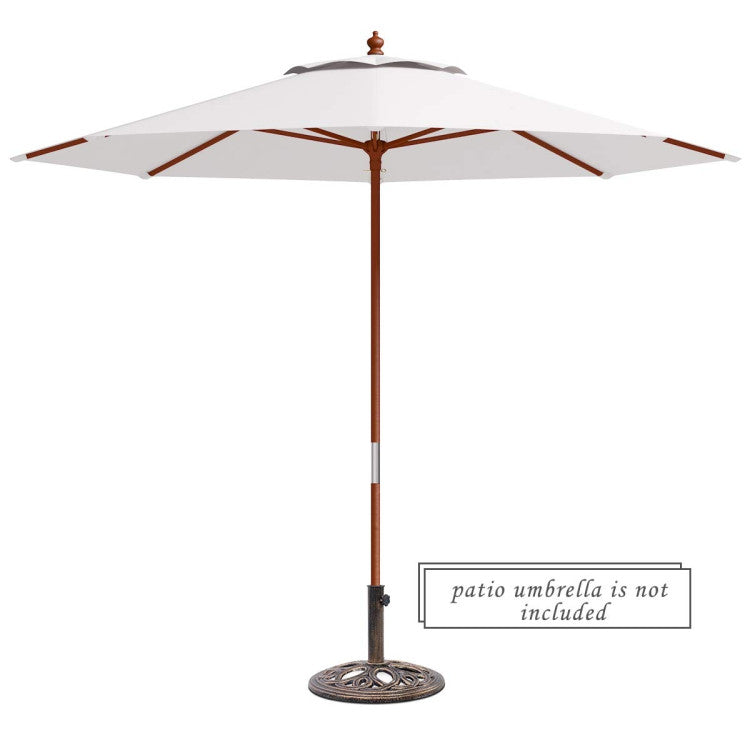 It is made of premium cast iron content that can withstand the sun and wind and last for many years. It has a circular base that allows it to bear a patio umbrella with excellent stability. Its elegant style, which features a petal-like pattern and a classic bronze color, makes it an ideal complement for all types of patio umbrellas. It's worth noting that the pole adapter can be mounted or relocated to fit 38 mm and 48 mm diameter columns, respectively. Installation is also simple, thanks to the structure's simplicity. It is an excellent option for residential or commercial use, from the backyard to the patio, from the poolside to the outdoor café.