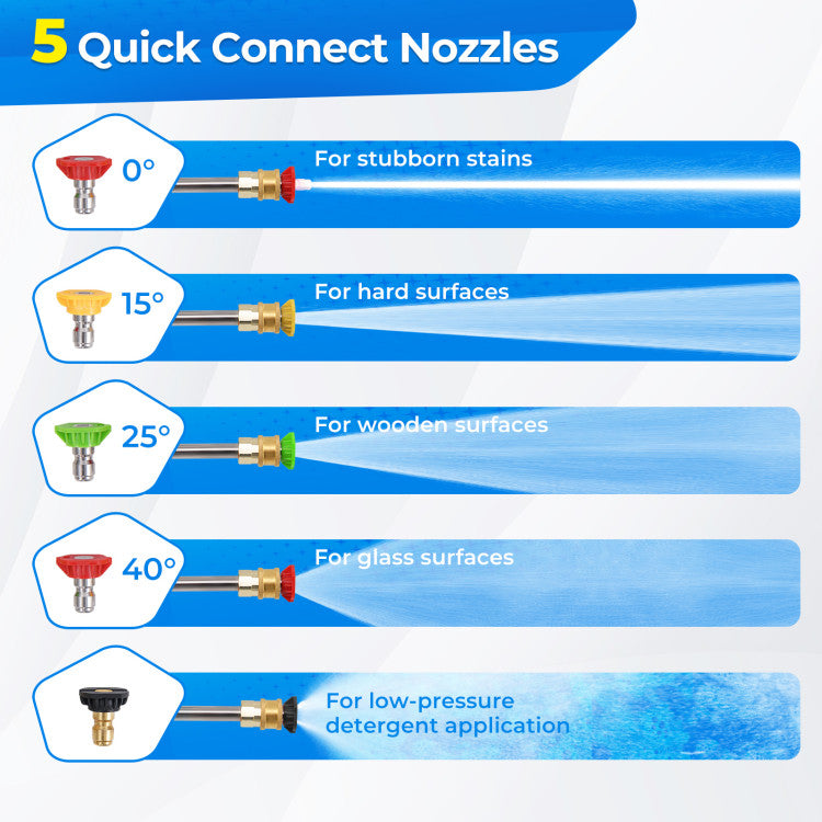 -Complete accessories include 5 quick connect nozzles and a soap bottle