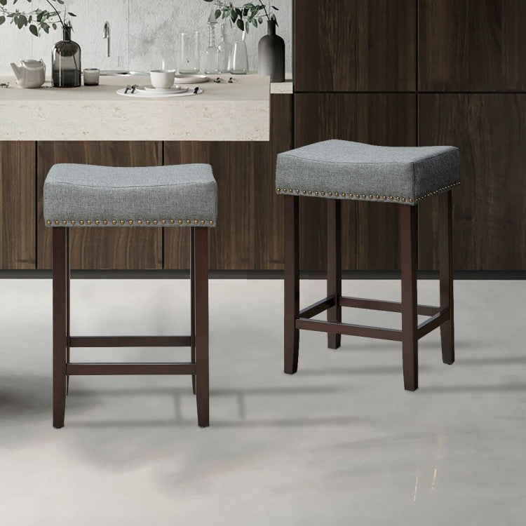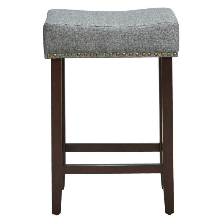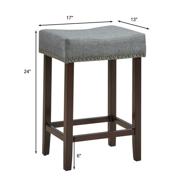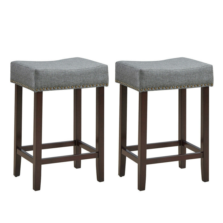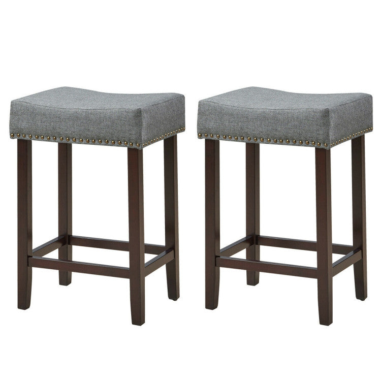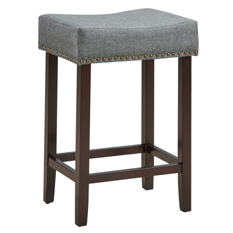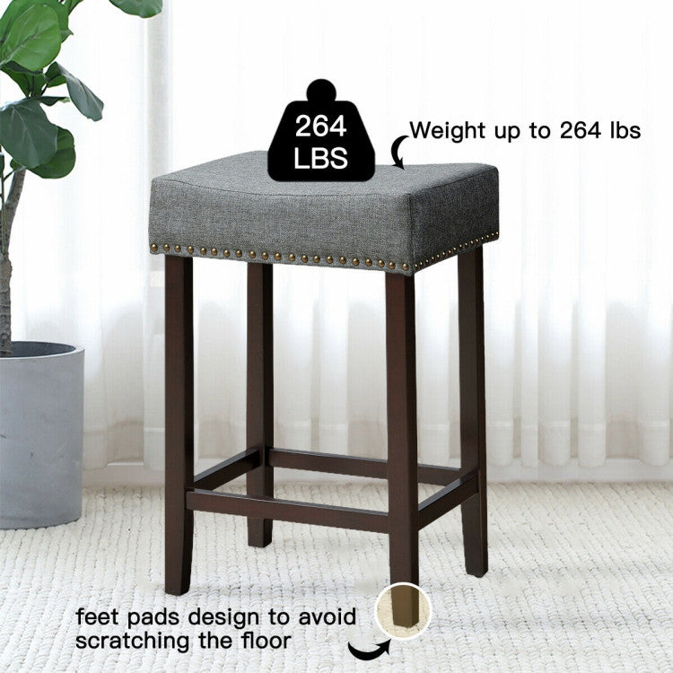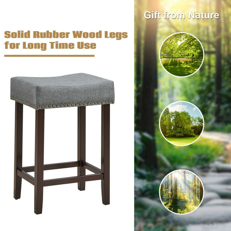 Made of solid rubberwood, these stools will provide you with years and years of use. The seats are firmly cushioned and equipped with linen upholstery. Ergonomically-designed saddle shape plus the feet pedals will provide you with double the comfort. Classic nail-head studs are set around the stools, giving them a royal and sophisticated look. In addition, these upholstered stools are easy to assemble with our easy-to-follow instruction manual. With a simple and elegant design, these stools are compatible with any decoration you have in your home, making them suitable for various locations.