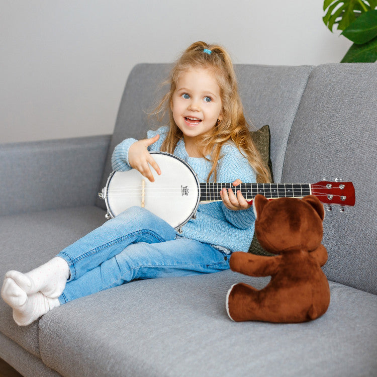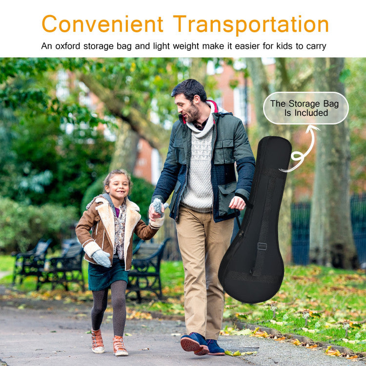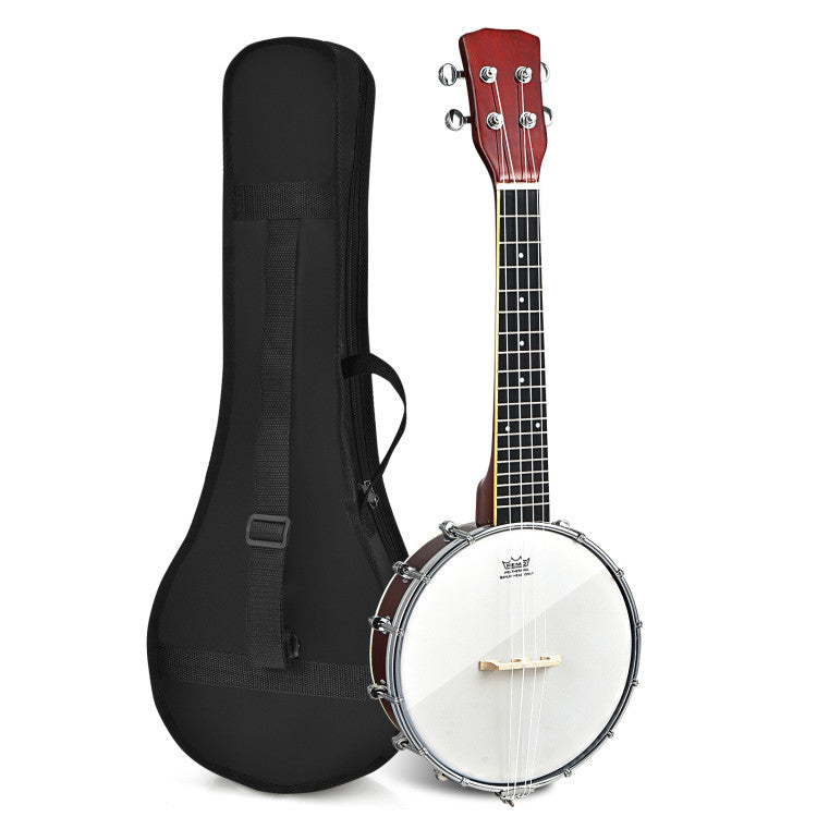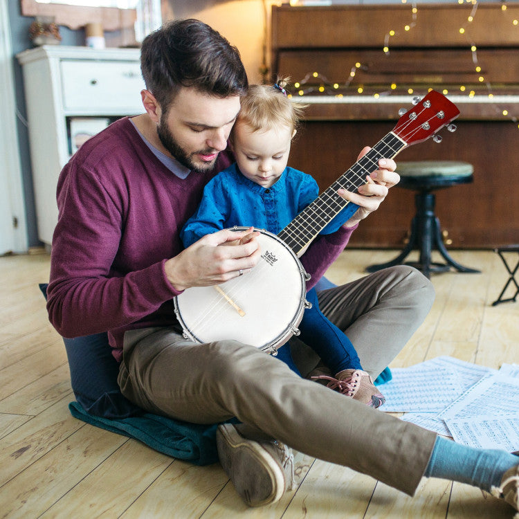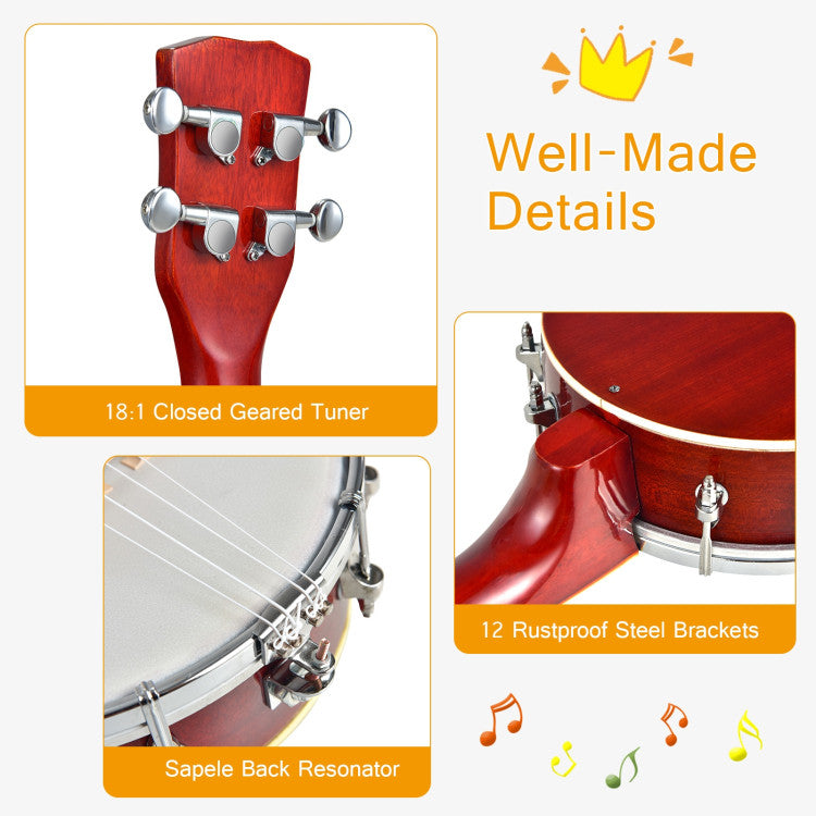 This mini banjo has a net weight of 3.5 lbs with a portable gig bag for traveling. It is beginner-friendly with a clear fingerboard made of technical wood, durable nylon strings, inlaid with cupronickel frets, and sound dots, which enables the novice to find the proper position. This 4-string banjo has a quick response with a maple bridge and has a Remo skin as well as a closed solid back for a better resonator. Using 12 brackets and 4 closed geared tuners, this travel banjolele performs in a stable sound condition. Suitable for playing blues, hillbilly music, or as an impromptu percussive instrument, our ukulele-style banjo is warmly welcomed by all the junior and senior players.