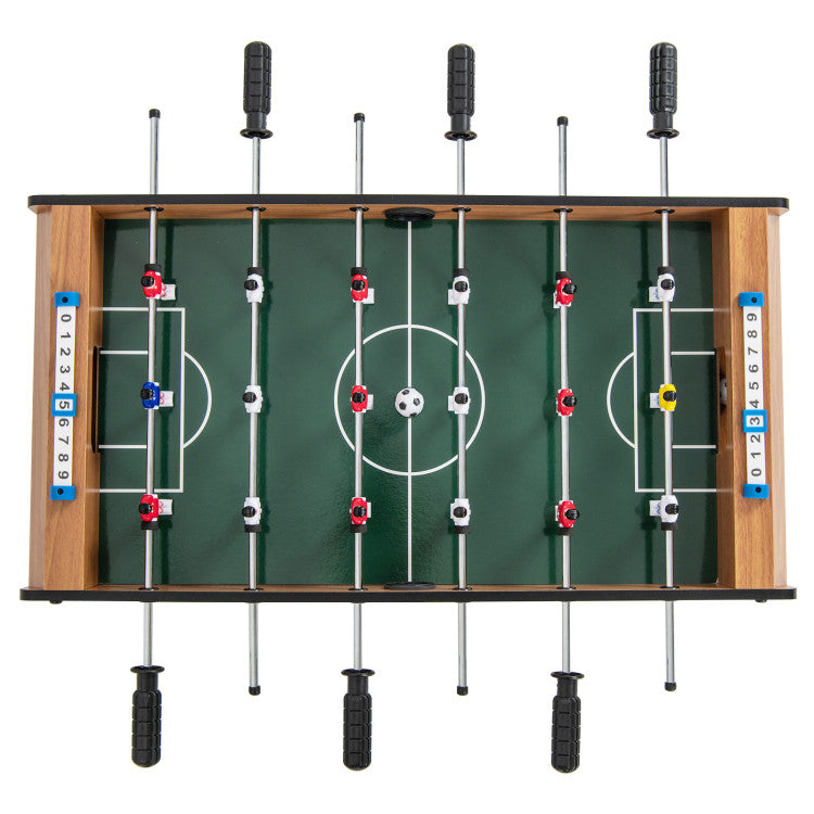 Tabletop Foosball Game Set: Measuring 27" x 14" x 9.5" (L x W x H), this portable tabletop soccer game has a comfortable size to carry, move around, and does not take up large amounts of space. It includes a simulated mini football field, 2 simulated football, 2 scoreboard, and 18 football players for competitive fun.