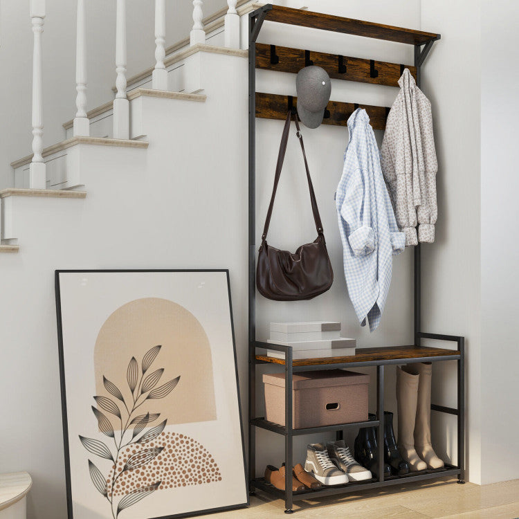 The 3-in-1 entryway coat rack with shoe bench is made of high quality metal tube and engineered wood that enjoys stable and firm structure for durable use. It owns nine flexible hooks for you to hang your coats, scarves and hats on it. The bottom shoe bench with three shoe racks could meets more storage requirements in daily life. It is ideal for keeping shoes and boots clean and orderly. Broad mesa and appropriate height provide you with a convenient and strong seat when you wear or take off your shoes.