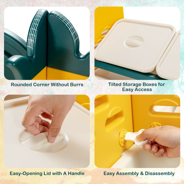 It features 6 plastic boxes with lids that can be used to store various toys and 7 shelves for storing books and other things. The child-proportioned height makes it easy for your little one to reach items. Your kids will fall in love with the storage and develop a good habit of organizing things. Besides, 4 ways of combination will meet your different storage needs. It can also be used as a seat for kids to rest. More importantly, kids-friendly PE material guarantees a 100% safe environment for carefree playing time. And large-sized parts provide you with convenience for assembly. Let's do it with kids!