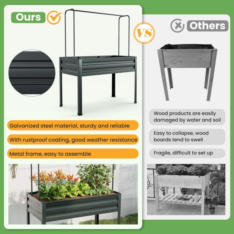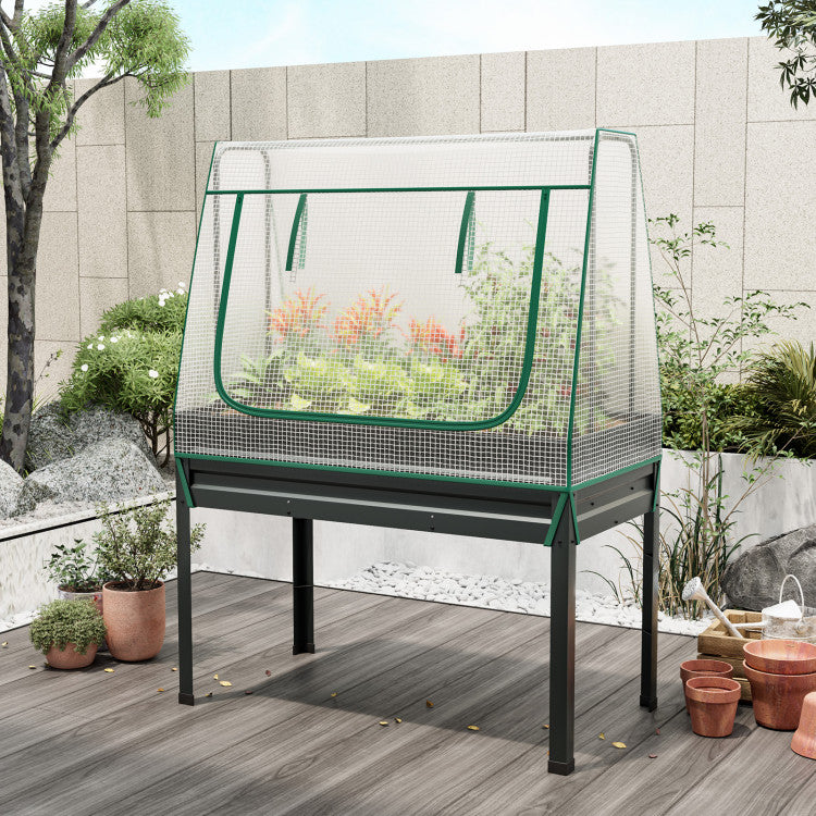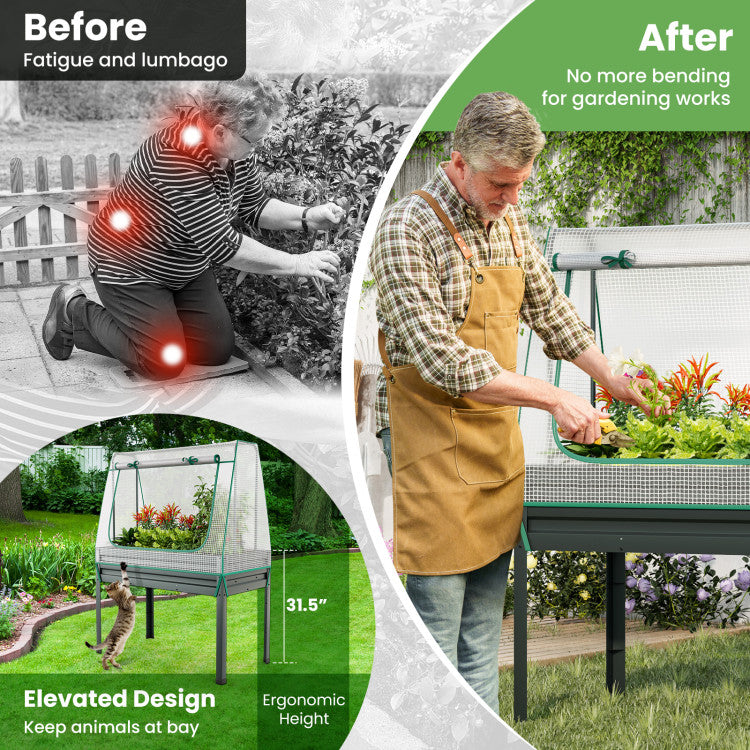 -Includes a raised garden bed with legs, a greenhouse cover, and a trellis