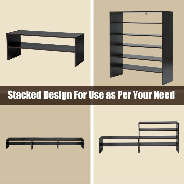 Stackable design is not only satisfies the fun of DIY, but meet your different storage needs. This three stackable shoe rack can be used individual or in combination as per your need. Additionally, three 2 tier storage shelves can be stacked into one 6-tier rack that provides plenty of space for shoes and cloths. Chic and compact design makes it suitable for living room and bedroom. With the detailed instruction and accessories included in the package, you can quickly install the shoe rack.