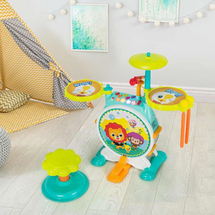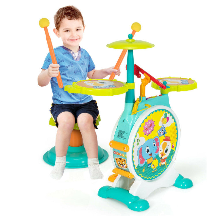 The drum set consists of a stool, two drum sticks, a microphone and a cymbal, enabling kids to beat, sing and play different music according to their needs. 4 play modes(drum and cymbal, sound, music, dynamic music), 2 volume adjustment modes(bass and treble sounds) and 15 songs can also offer your kids endless fun. Besides, ABS and PP materials are safe to use. ASTM and CPSIA certifications ensure higher security. smooth surface and rounded corners protect kid's delicate skin. Large base allows for excellent stability. In addition, 25.5" height and stool allow your toddler to play the drum with comfort. Rich colors promote kid's color recognition. Additionally, it is also beneficial to kid's hand-eye coordination and musical creativity.