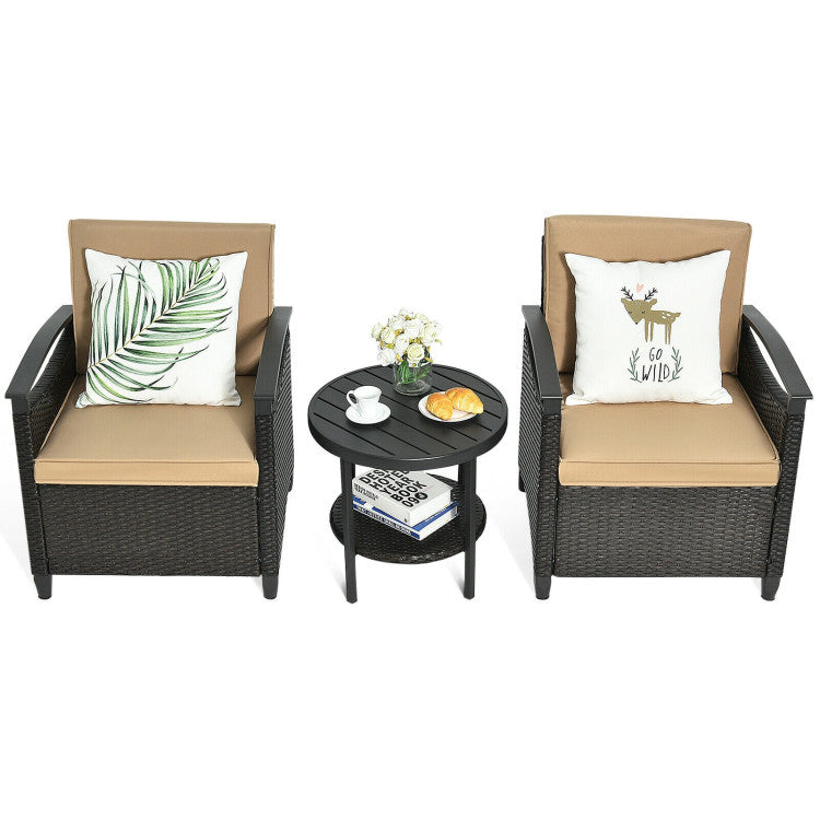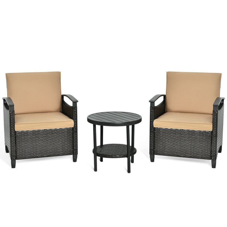 Anti-skid mats at the bottom ensure the overall stability and protect the floor. And the rust-resistant tabletop is easy to clean and the lower shelf provides additional space to hold books. Besides, equipped with an ergonomic backrest and soft cushions, this sofa set relieves your fatigue for the whole day. The modern and simple style makes this furniture set suitable for your patio, garden, and backyard.