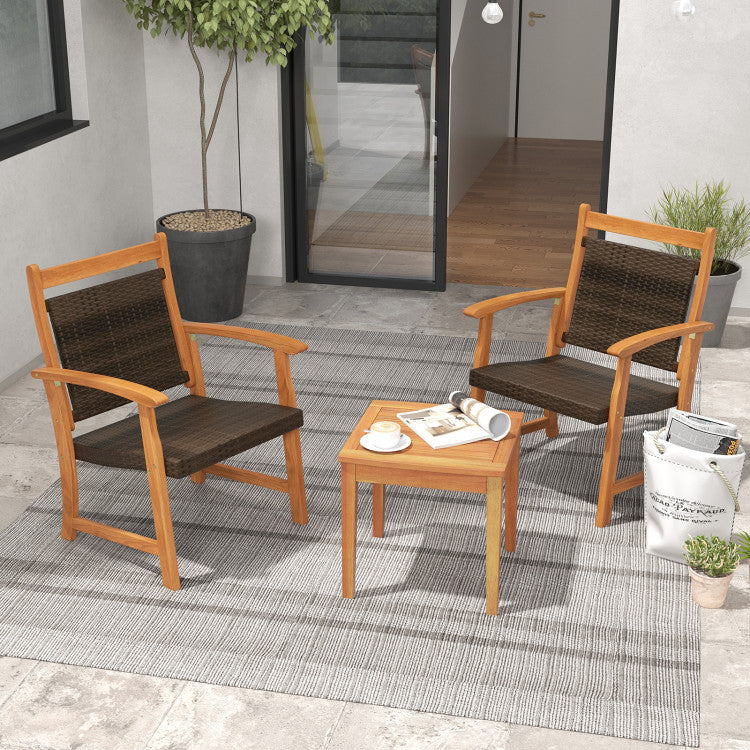 Solid hardwood material forms a strong structure for chairs and tables while the PE wicker guarantees a breathable seat and backrest. This bistro set creates leisure and intimate spot with 2 comfortable seats and a side table. Besides, it is easy to assemble the chair set if you follow the instructions correctly. Elevate the outdoor settings with this 3-pieces outdoor patio furniture set!