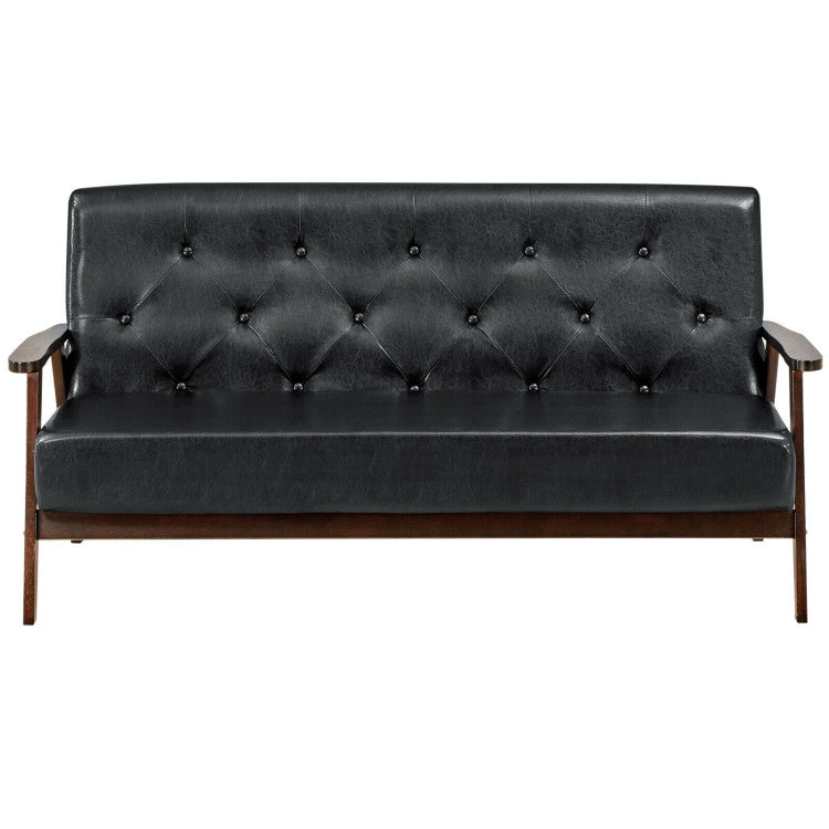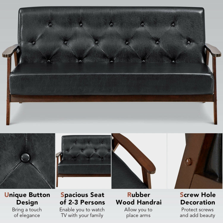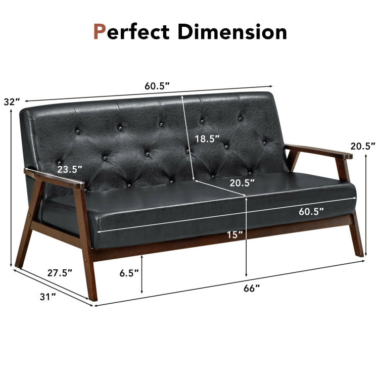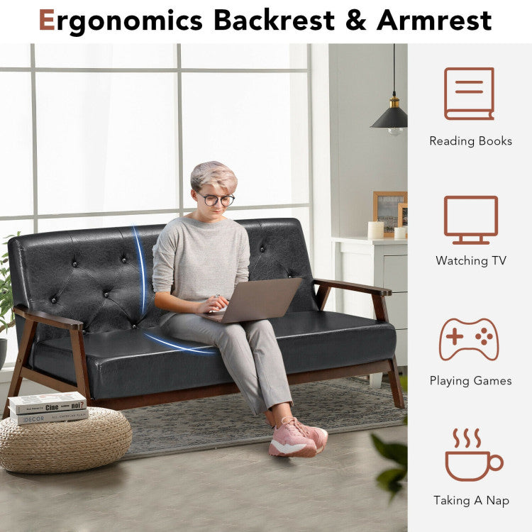 100° backrest angle, ergonomic backrest and armrests allow you to sit or lean on it with comfort. You can freely read books, watch TV, play game or take a nap on the sofa. Besides, PU leather and high-elastic sponge ensure utmost comfort and durability. A-shaped frame, solid crossbar and rubber wood legs allow for excellent stability and sturdiness. Additionally, backrest button decoration and screw hole decoration make it a perfect addition to your home. Rounded corners protect your delicate skin. Our sofa is easy to assemble.