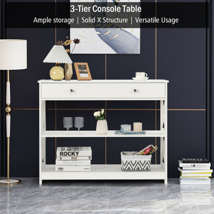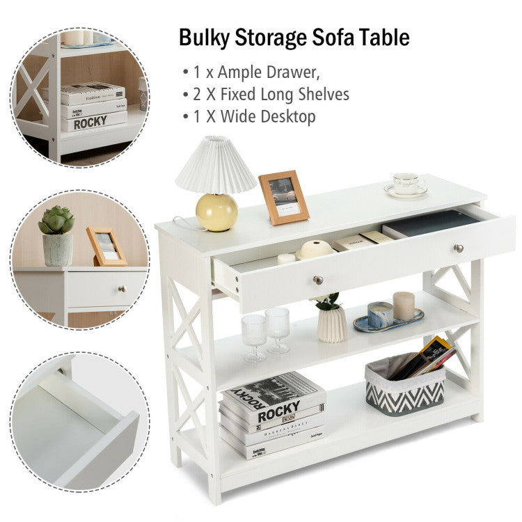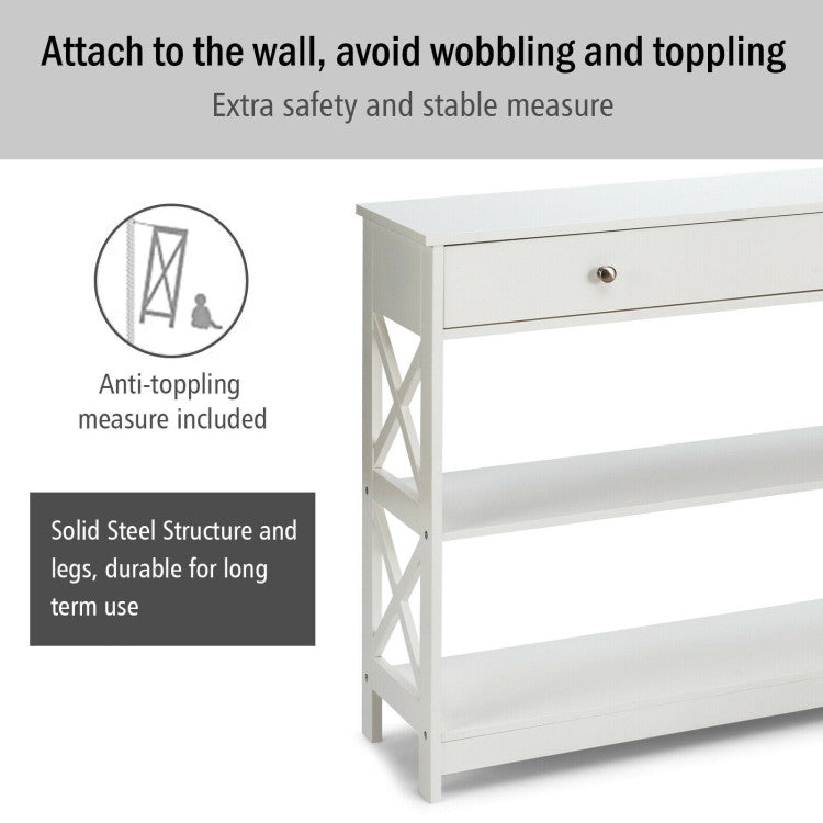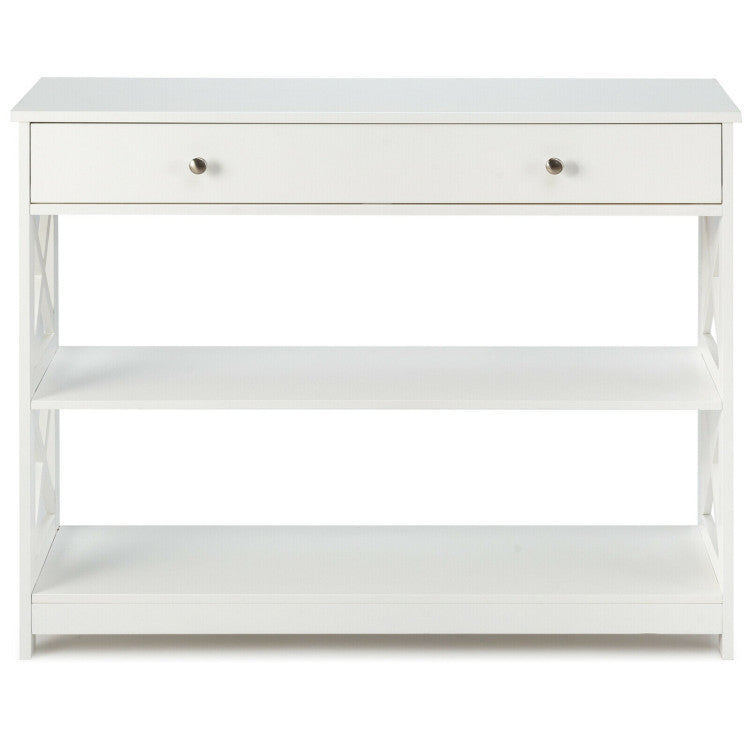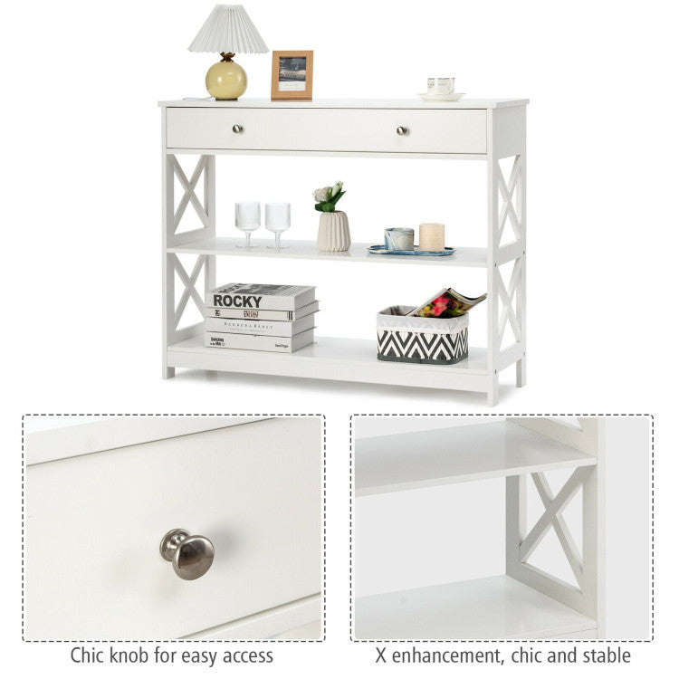This accent table featuring 1 bulky drawer,2 long shelves, and a wide table desk, this accent table offers you ample storage and display areas.