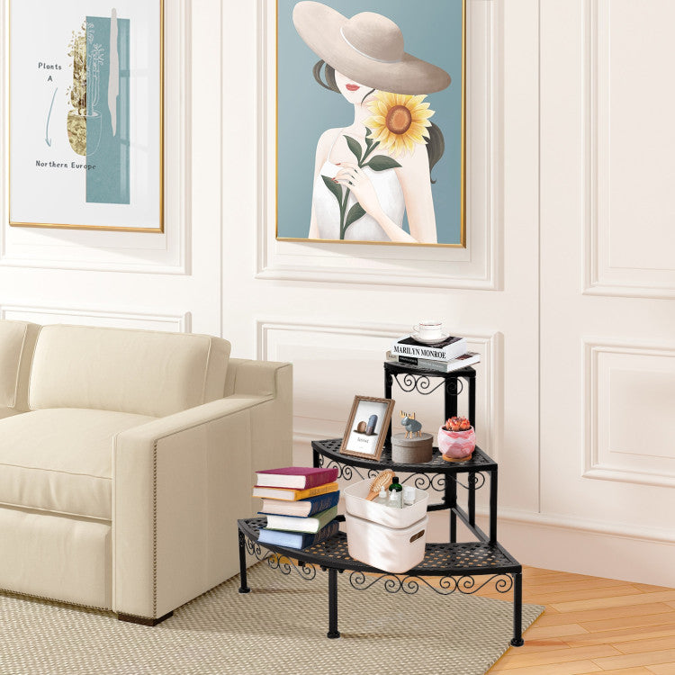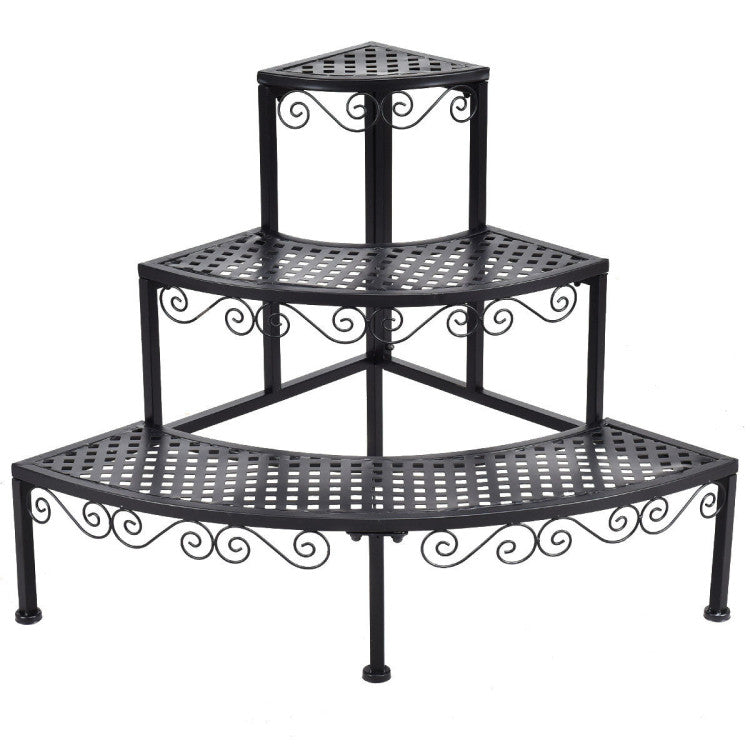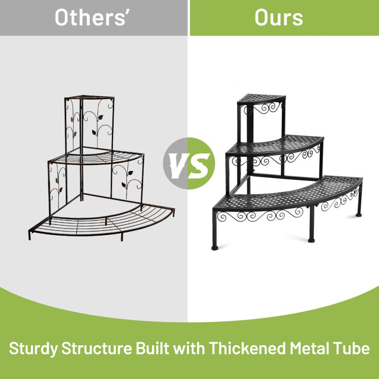 3 Tier Stair-step Style plant stand: This stair-step style iron plant display stand is suitable for both indoor and outdoor use. This shelf has a really beautiful black finish and an elegant floral design. Last Long Using: Constructed of sturdy iron tubing and coated in weather-resistant black paint. And this metal plant display stand is sturdy enough for flower pots. Enough Putting Space: Approximate overall dimensions 24" L x 24" W x 23.6" H of the plant stand. And the top shelf is the smallest one and the bottom shelf is the biggest one. Provide more space where you could put your potted plants, shoes, and other things on it. Suitable Weight Capacity: The lowest tier is the 22 lbs weight limit, the middle tier is 17.6 lbs and the top tier is 15.4 lbs. Its suitable stair-step design is ideal for flower pots display, perfect to display decorative items like live potted plants, vacation souvenirs, picture frames, and so on. Wonderful Home Decoration: Easy assembly is required and will make a great addition to your patio and office. It will also give your favorite plants a supremely stylish showcase