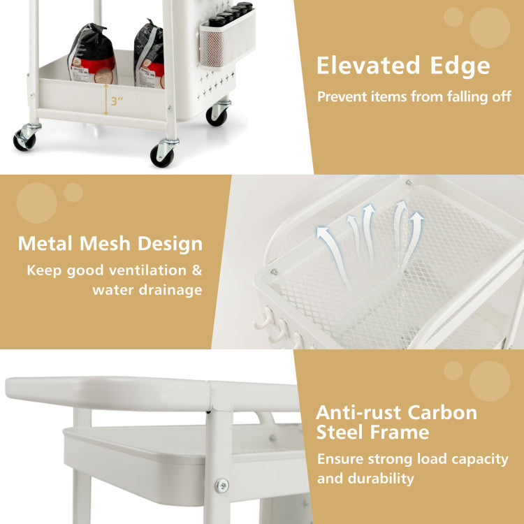 The utility cart with a space-saving and tiered design doesn't occupy too much floor space while bringing ample storage space to your home and office. The 3 mesh shelves can hold various sundries. Besides, the detachable pegboards are equipped with 2 bins and 4 hooks, providing you with a DIY area for the personalized organization. The powder-coated carbon steel ensures great stability and durability. With 4 universal casters, you can easily move the cart from room to room. Moreover, 2 of the wheels can be locked in place to avoid sudden movement.