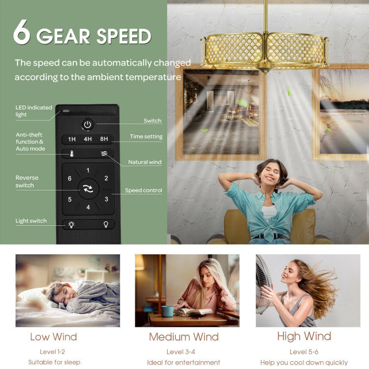 Just a ceiling fan with light is enough and there is no need for other single chandelier or fan!6 fan speed levels satisfy your different needs and the remote control makes the operation quite convenient. The auto mode and anti-theft function are of high functionality. And you can set the operating duration from 1 to 8 hours before going to sleep. Though powerful the DC motor is, it runs without any noises, which is good to your sleep. Additionally, the reversible motor allows the ceiling fan to be used in both winter and summer. This caged ceiling fan is truly an appealing household decoration of high utility.