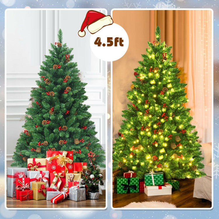 This tree is tall, leafy, and fluffy with 516 branch tips, which will be a great decoration at Christmas. 300 LED lights, 32 groups of pine cones, and red berries add a warm festival atmosphere, making the tree more gorgeous and attractive. PVC branches are environment-friendly and fire-resistant for long-time use. The iron stand makes the tree stable without tilting. Besides, the branches are connected to the trunk by hinges to set up effortlessly in a short time. It is suitable for home and business use.