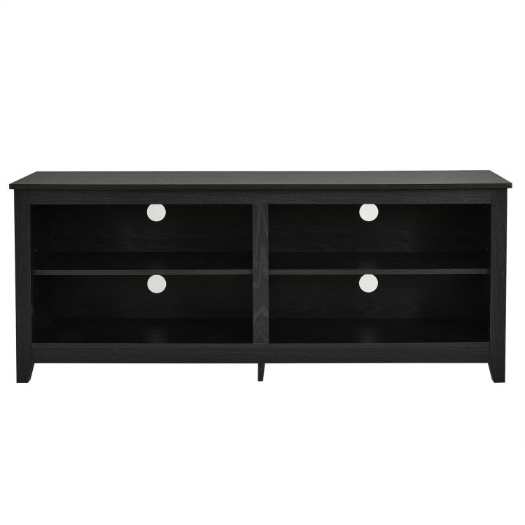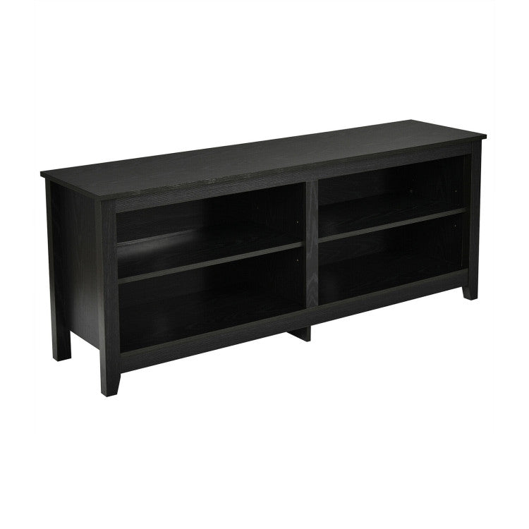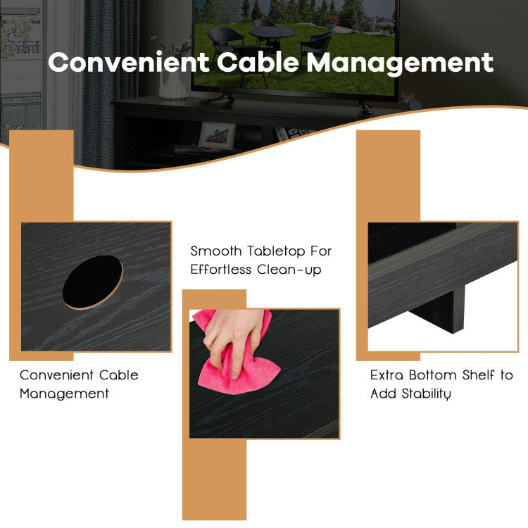 The TV stand provides excellent viewing if it is served to support your flat-screen TV. Displaying your aesthetic ornament can be easily achieved since it can be worked as a storage cabinet as well. Its spacious tabletop makes it possible to place TVs up to 65" inches. 4 open cubbies hold books, magazines and game equipment to create a tidy living environment. You can flexibly adjust the height of the internal storage space according to different storage needs thanks to the 3-level adjustable shelf. Even more data cables can be neatly organized through the 4 cable management holes. Notes: The tape on the 2 back panels is one of the common ways to reinforce the back panel and protect them from separation.