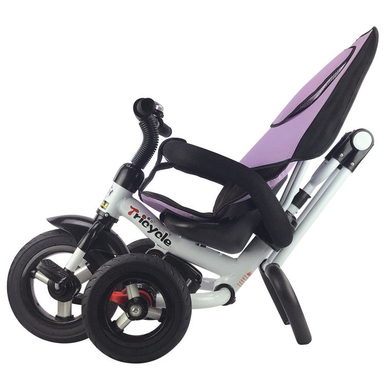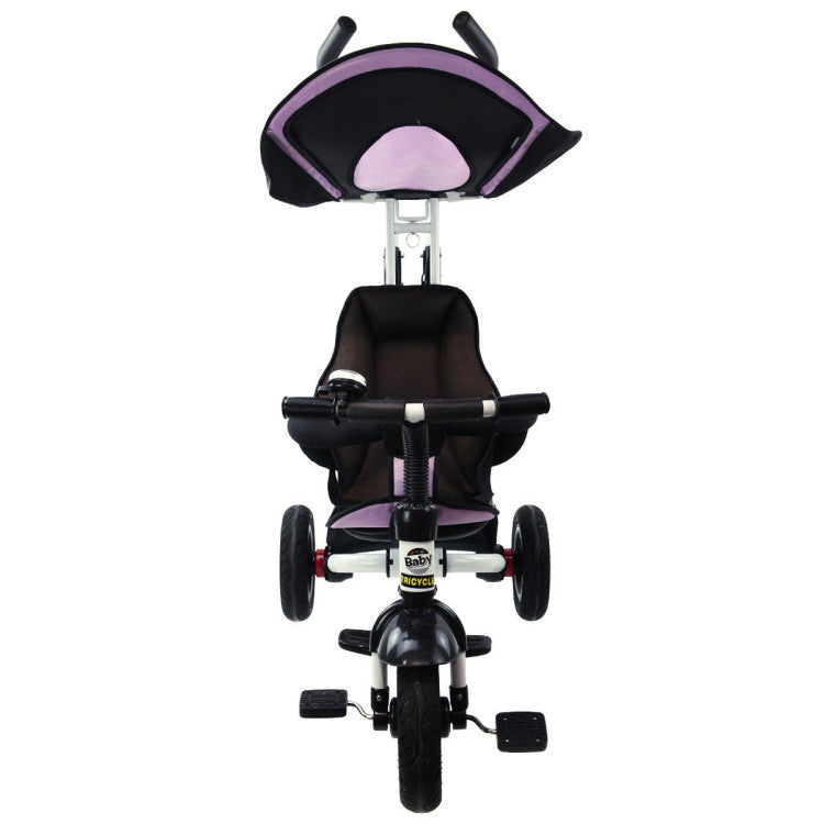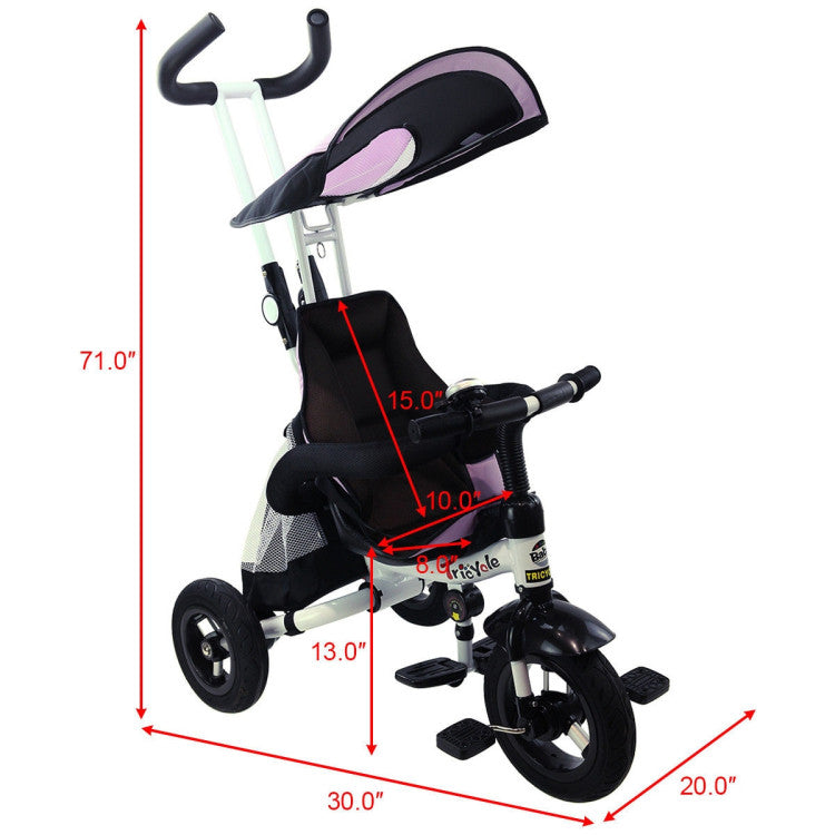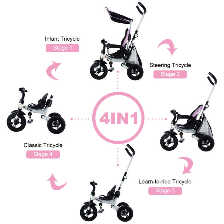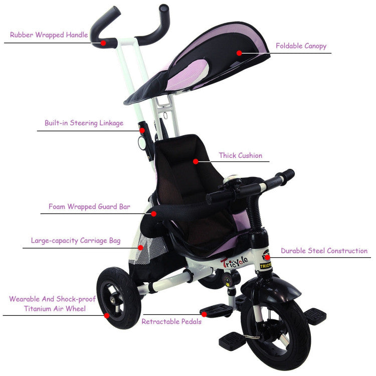 The tricycle can be assembled in 4 ways and can be converted from a stroller to a steering tricycle, learning-to-ride- tricycle, and finally a classic tricycle. This baby tricycle has a parent handle which is made for steering, while adjustable removable pedals are designed to prevent baby's feet from being hit by front wheel. It features many secure designs, such as a safety belt to keep your little one safe. And a padded handrail which is crash-proof is also removable for baby to get on and off easily.