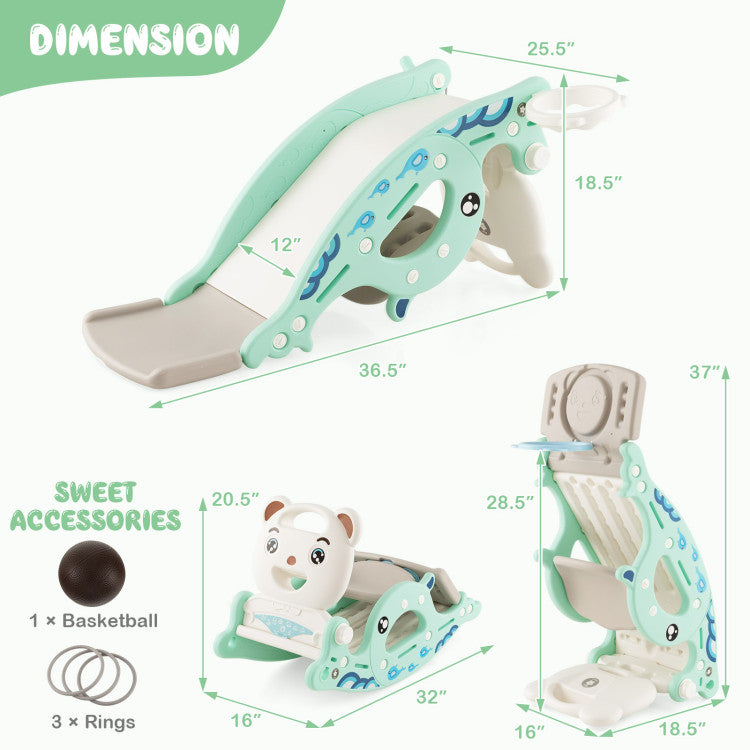 -Easy switch between rocking horse, toddler slide, and basketball stand modes