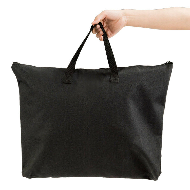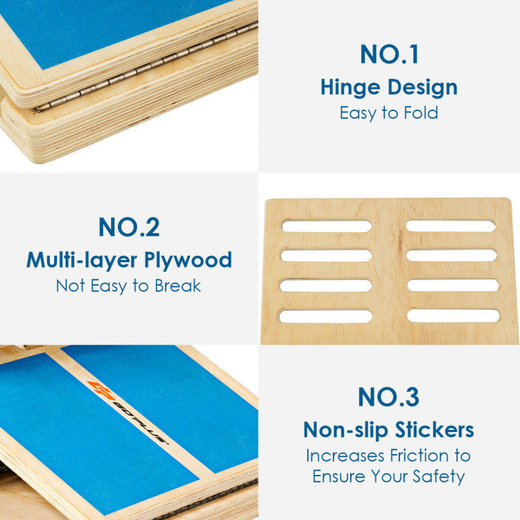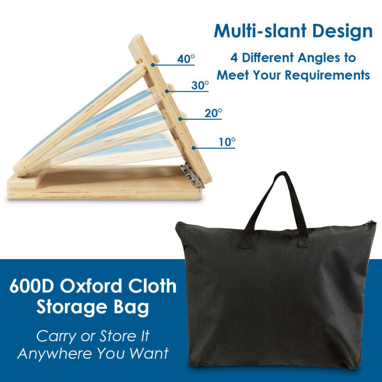 This slant board is a flat-surfaced board, made of heavy-duty multilayer plywood that can withstand up to 350 lbs of weight. The anti-skid tread with frosted texture and stable tripod structure ensures your safety and the overall stability of the structure. The foldable design and hinge detail make our wooden incline board easy to carry and store. Simply fold the boards on either side and put them in an Oxford cloth storage bag.