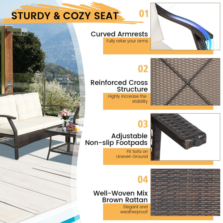 High-quality PE rattan and sturdy steel frame feature outstanding sturdiness and durability, which can stand the test of time. Soft cushions also ensure a comfortable seating experience. In addition, the durable Oxford fabric cover with waterproof coating and PU coating can extend the service lifespan of the patio rattan furniture set. Designed with ergonomic backrest and armrests, this versatile patio conversation sofa set can relieve your fatigue instantly. Plus, the mixed brown PE rattan with stylish style matches well with any furniture style. Please refer to the size description before purchase(there may be small dimensional discrepancies because of the manual measurement). Please do not tighten all the screws until all the holes are aligned.
