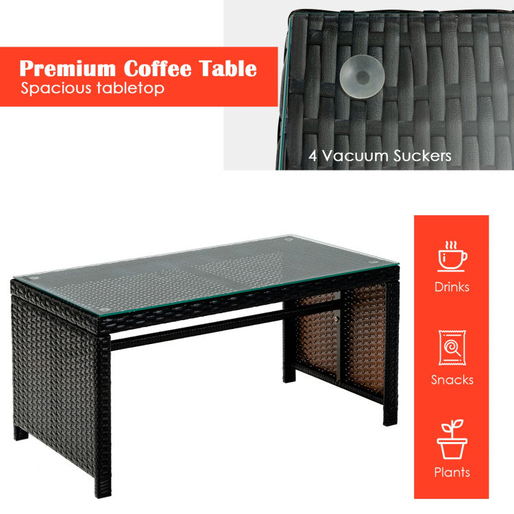 Crafted with premium rattan, each piece creates a cool and textured appearance, which perfectly matches your outdoor or indoor space. In addition, rattan features the advantage of weather resistance to creating an excellent user experience. The tempered glass coffee table comes with four suckers, which provide superior durability while bringing convenience. The high resilience foam seat adds softness dedicated to supporting and relaxing your hips. This outdoor furniture set includes 1 loveseat, 2 single chairs and 1 coffee table that can be freely combined based on your favorite.