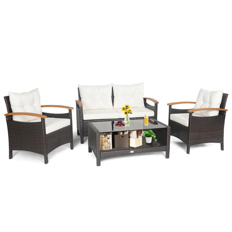This 4-piece patio rattan conversation set will be a perfect addition to your backyard or other outdoor occasions.