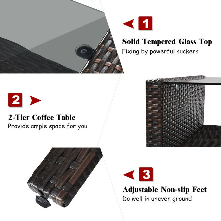 -Rattan coffee table with tempered glass top and large storage space