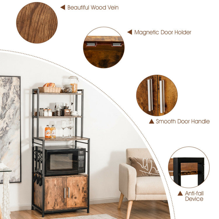 You can use it as your study bookcase, kitchen storage cabinet or living room display shelf. Equipped with 4-tier open shelf and large capacity cabinet, it offers enough storage for your books, flavouring, tableware, kitchen appliance. S-shaped hooks also allow you to convenient put kitchen utensils and towels within your reach. In addition, high-quality engineered wood and iron pipes ensure high durability and excellent load capacity(Each shelf and cabinet: 44 lbs; each hook: 11 lbs). It‘’s also designed with adjustable feet for additional stability. Additionally, raised baffle protects your items from falling. Door handle and magnetic door holder help you to open and close the door with convenience. 2 doors allow for privacy protection and dust prevention. It's easy to install and clean.