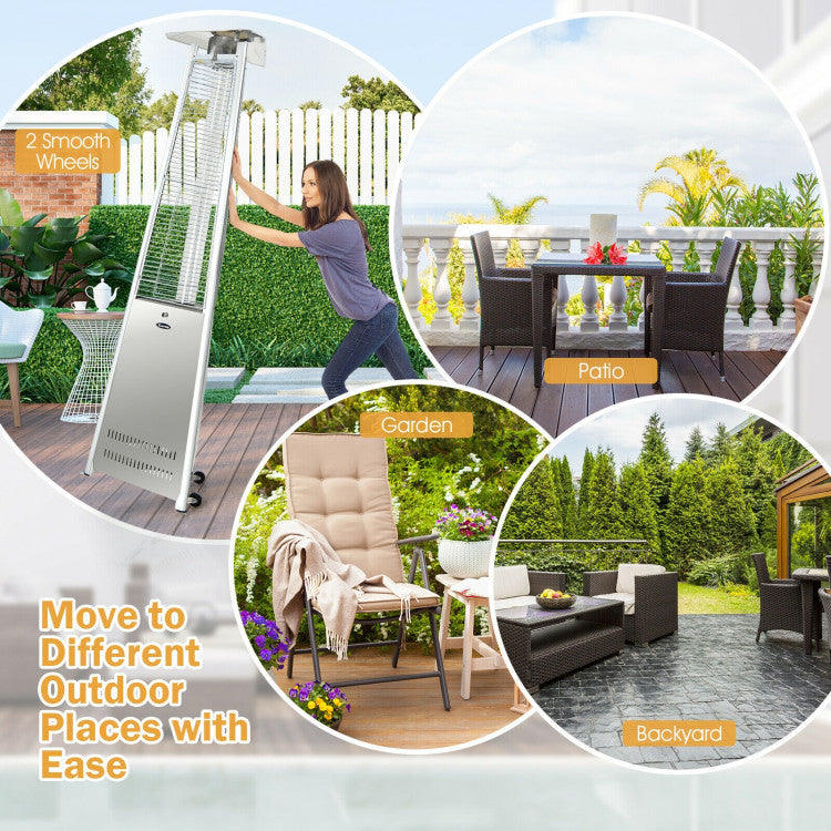 By the quick start of the simple ignition system, this 42,000 BTU patio heater with 360° full-area dissipation can heat up 215 square feet. Through heat-focusing reflective cover and flame emitter, the comfy warmth will be passed on to everyone around it. And the flameout and tip-over protection keep you safe while using it. And the rope is designed for a 20 lb. propane tank (not included) fixation. When finishing the outdoor gatherings, you can move it easily via 2 smooth wheels.